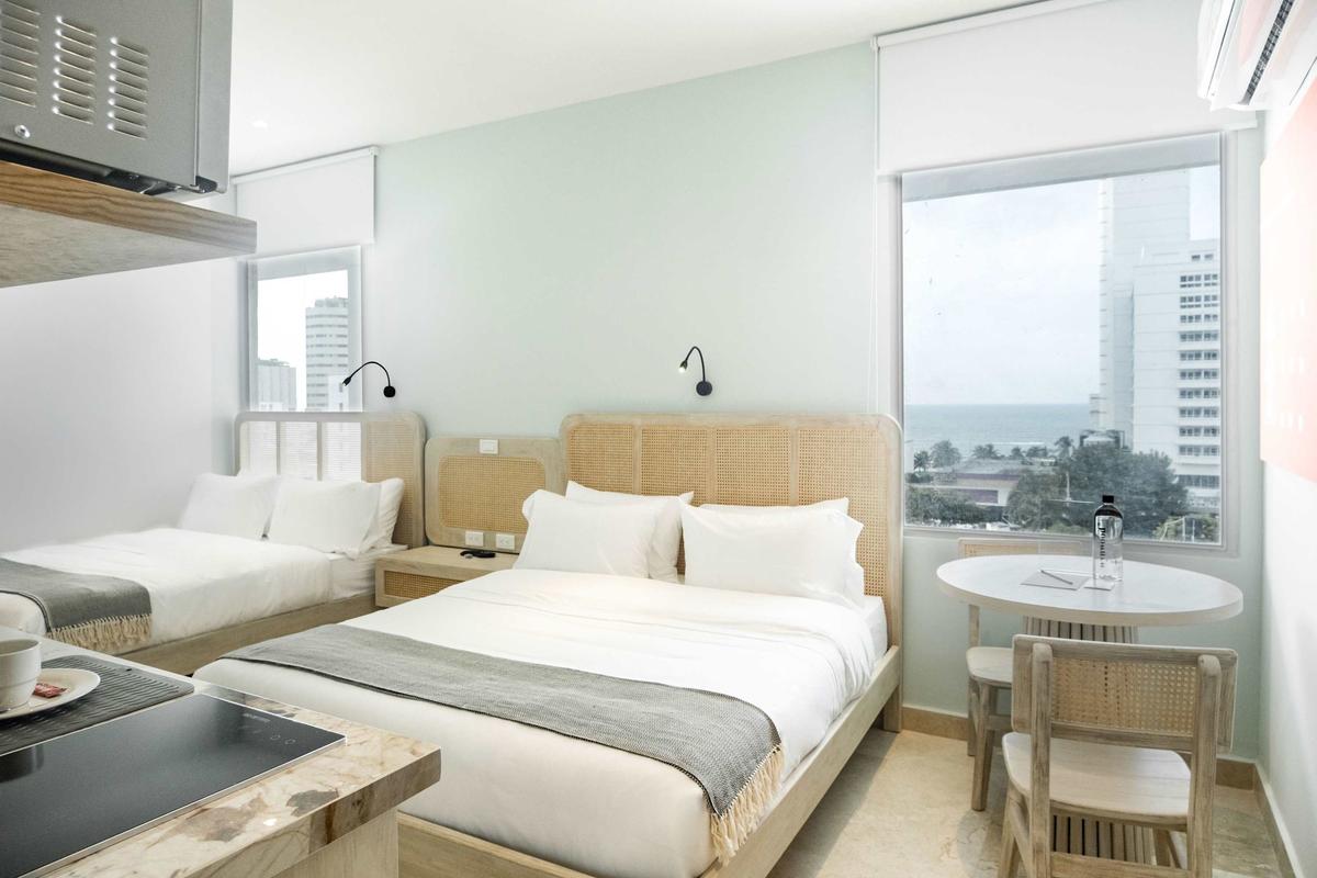 Brand-new 31 sqm exterior-facing studio with two beds, ideal for up to four guests, located in a luxury hotel-style tower on one of the best blocks in Bocagrande. Thoughtfully designed with premium finishes, modern kitchenette, air conditioning, and fast Wi-Fi—perfect for friends or families traveling together. The well-known Spinning Center Gym Cartagena is located within the same tower.