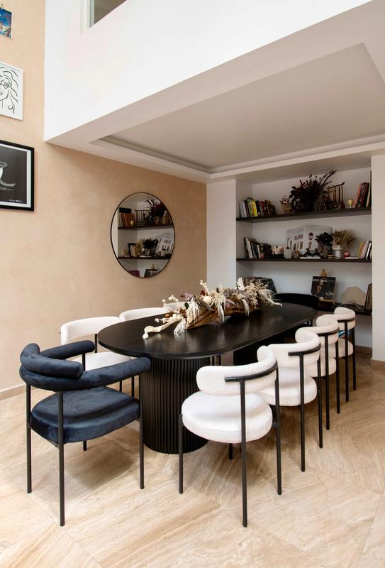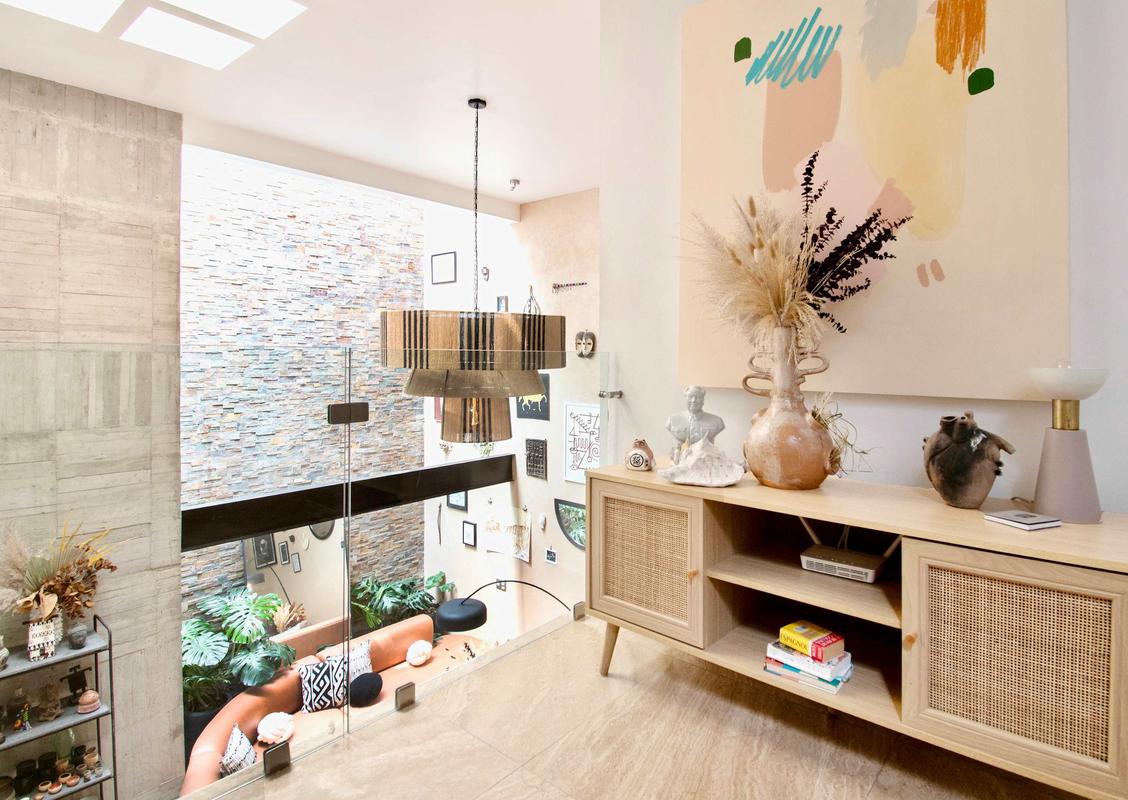 Beautiful house that welcomes you with a triple-height living room adorned with a curated art wall: pieces collected over years of travels and explorations. The spaces blend warmth and modernity, with materials ranging from polished stone to woven fibers, terracotta tones, and abundant natural greenery.