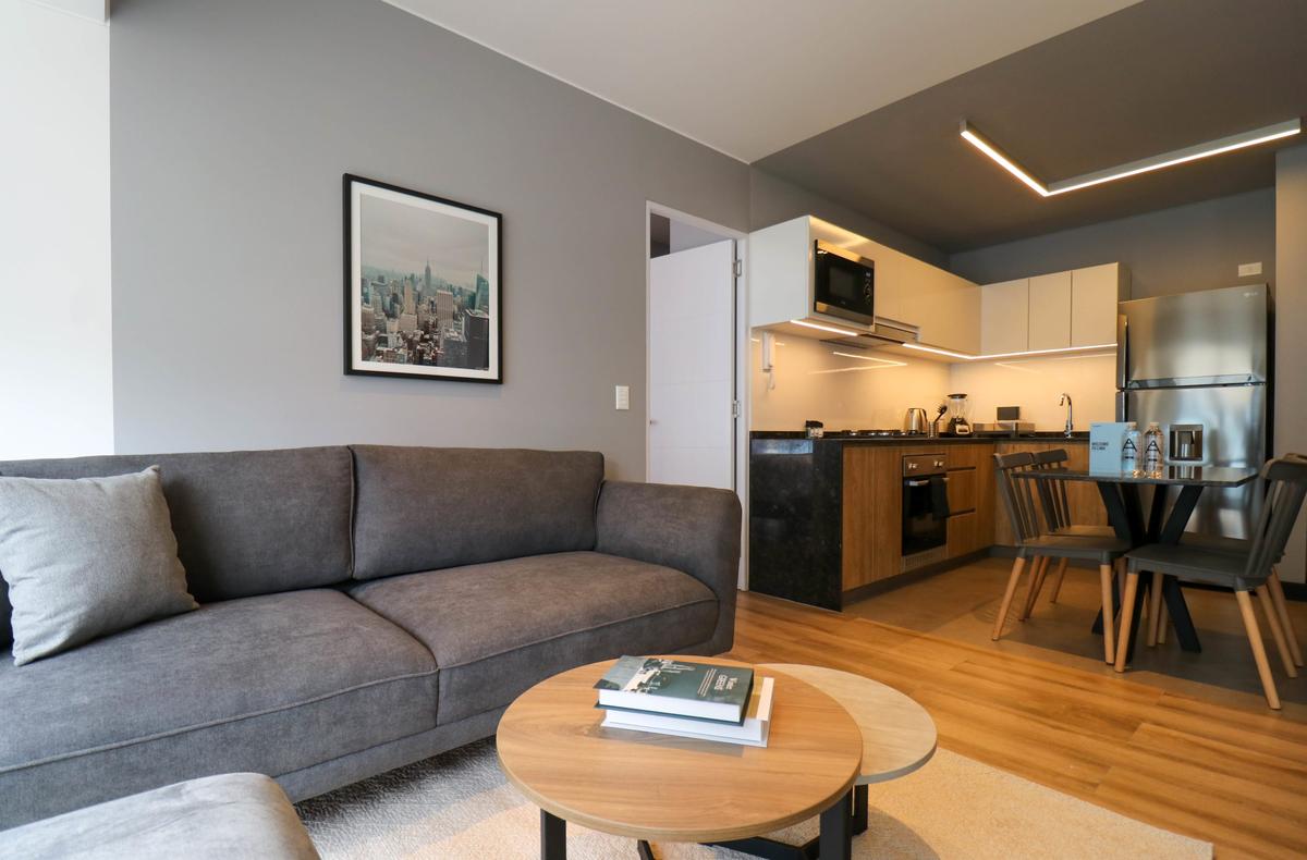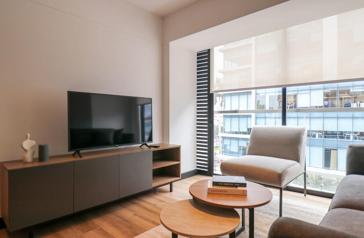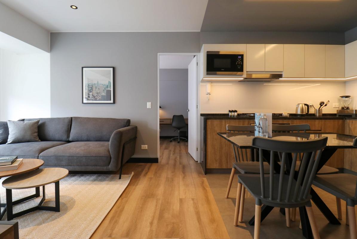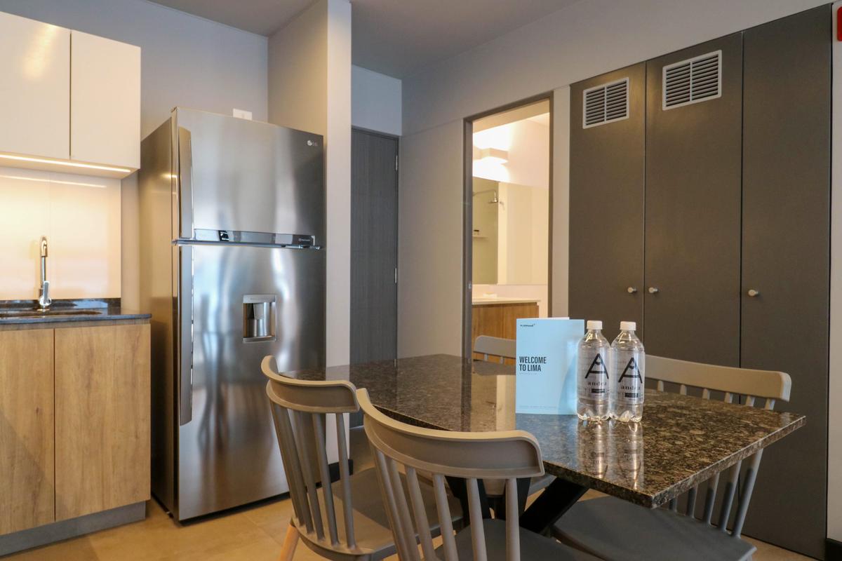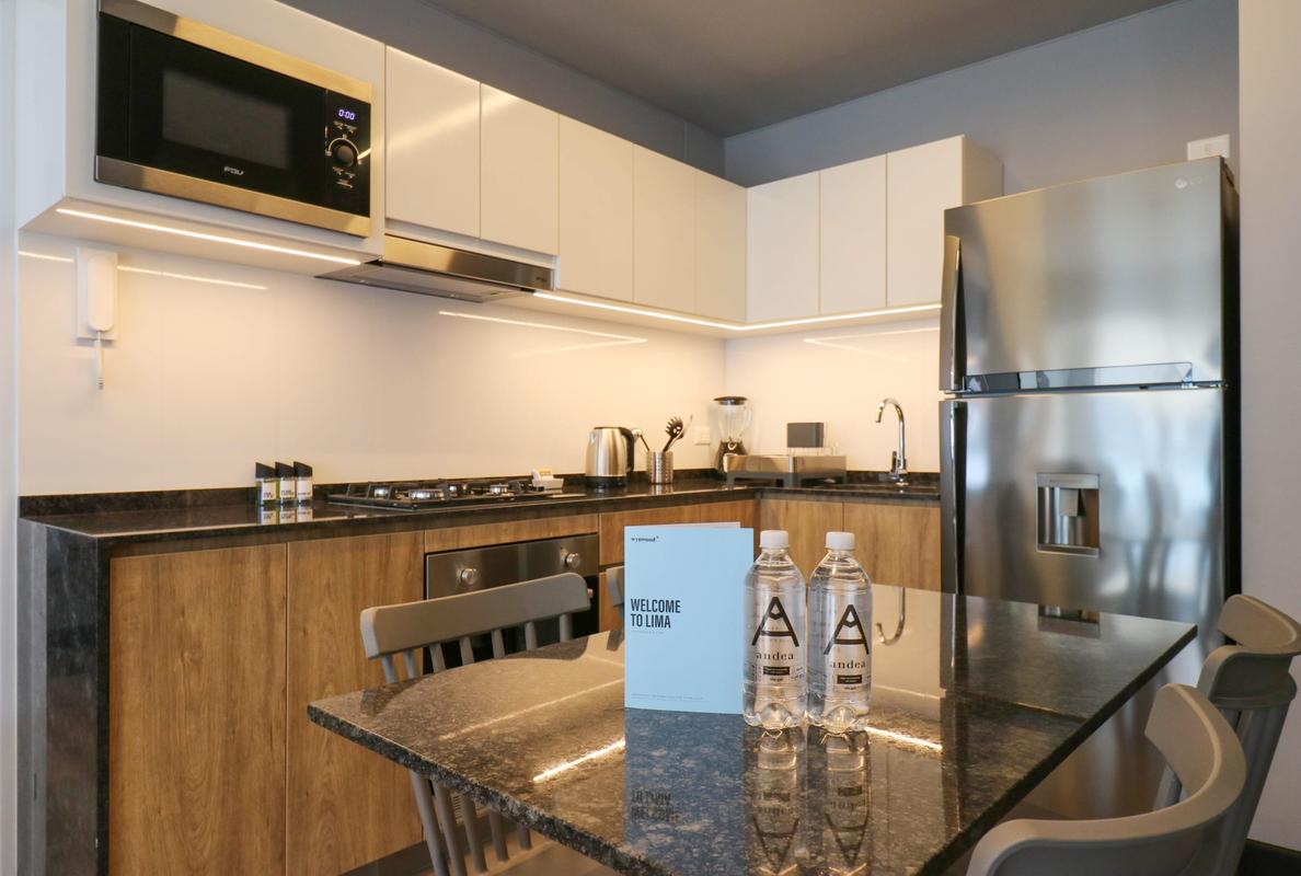 In the welcoming Miraflores neighborhood, this beautiful apartment it's very well located; just minutes away from Larcomar shopping center, Parque Kennedy, Virgen de Fatima Parish, and exclusive gyms. The area has currency exchange services, and labs centers in case you need to take a test, such as ROE and Multilab.