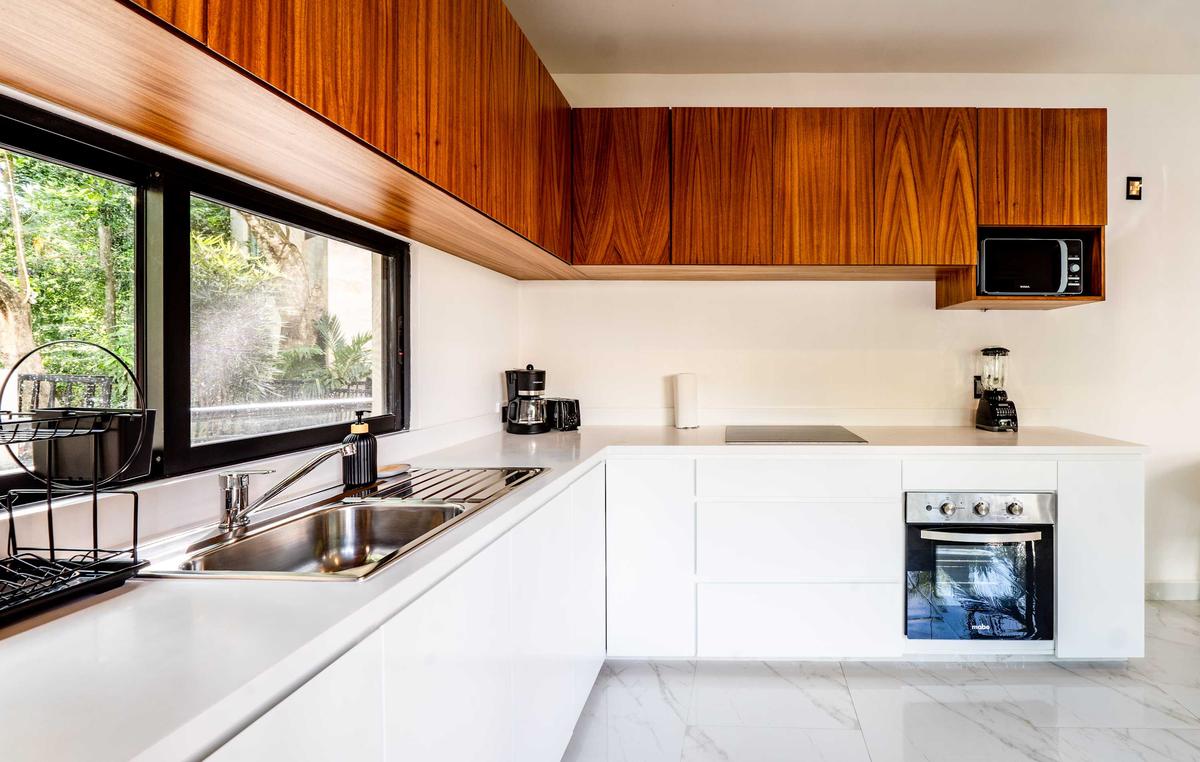 The apartment has two spacious bedrooms, each with a private bathroom and extra-large beds that can be converted into two double beds depending on your needs. On the ground floor, you’ll find bright living and dining spaces perfect for spending quality time, while the bedrooms offer a tranquil and cozy environment for a restful stay.