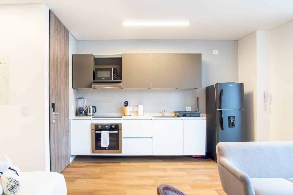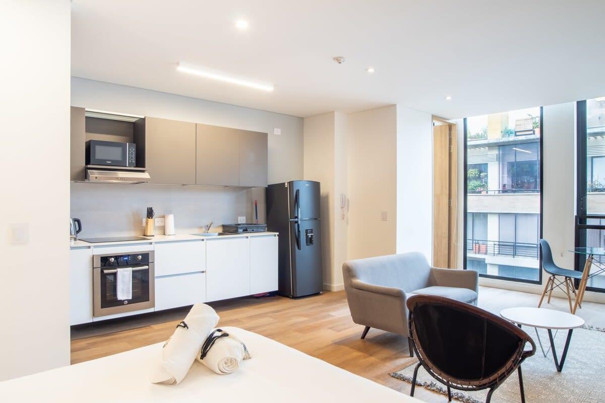 Located in the best area of Bogotá. Ideal for business trips, families and groups of friends who want to stay in a spacious modern 1 Bedroom. You will be walking distance from the shopping center, restaurants, top gyms, supermarkets, bars and coffee shops in the city. It's a concept, decentralized hotel that brings together travelers from across the globe into a network of apartments – spread around the world – with staple quality, design, educational purpose and sustainability.
