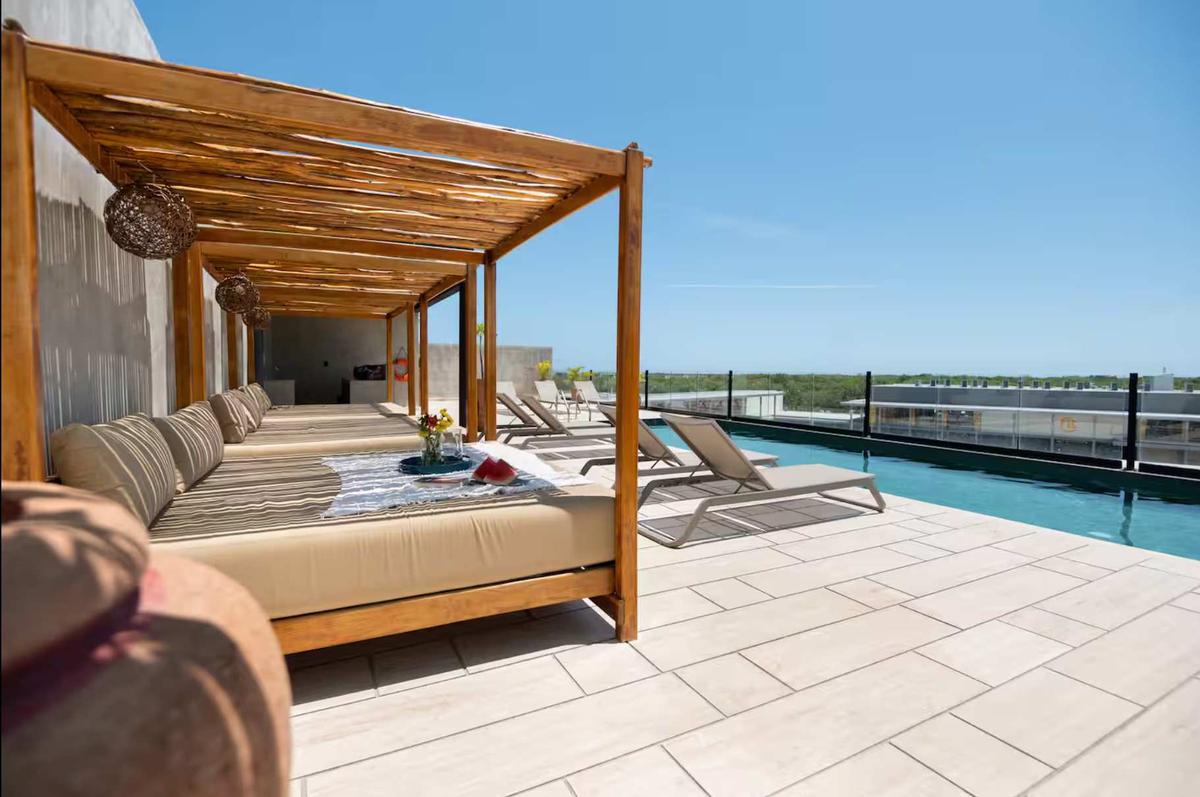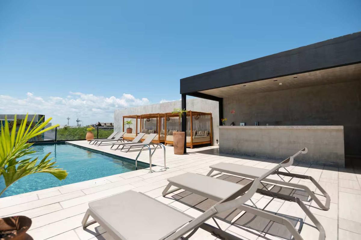 The studio includes two complimentary bicycles so you can explore Tulum at your own pace. The bike path is located just across the street, allowing easy access to the beach, local cafés, or downtown shops. The building also offers a spectacular rooftop pool with panoramic jungle views—ideal for relaxing or working outdoors—a restaurant with delicious food, and a fully equipped gym.
