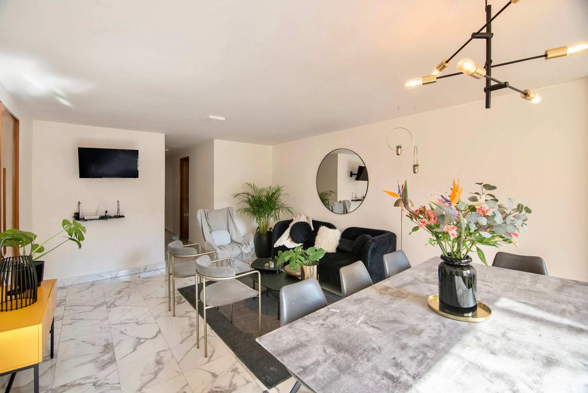 The apartment features a fully equipped kitchen, dining area, and living room, as well as three bedrooms: one with a queen-size bed and a private bathroom, another spacious room with a king-size bed, and a third smaller room with a full-size bed. These last two share a full bathroom. Everything is designed to offer a comfortable and functional stay.