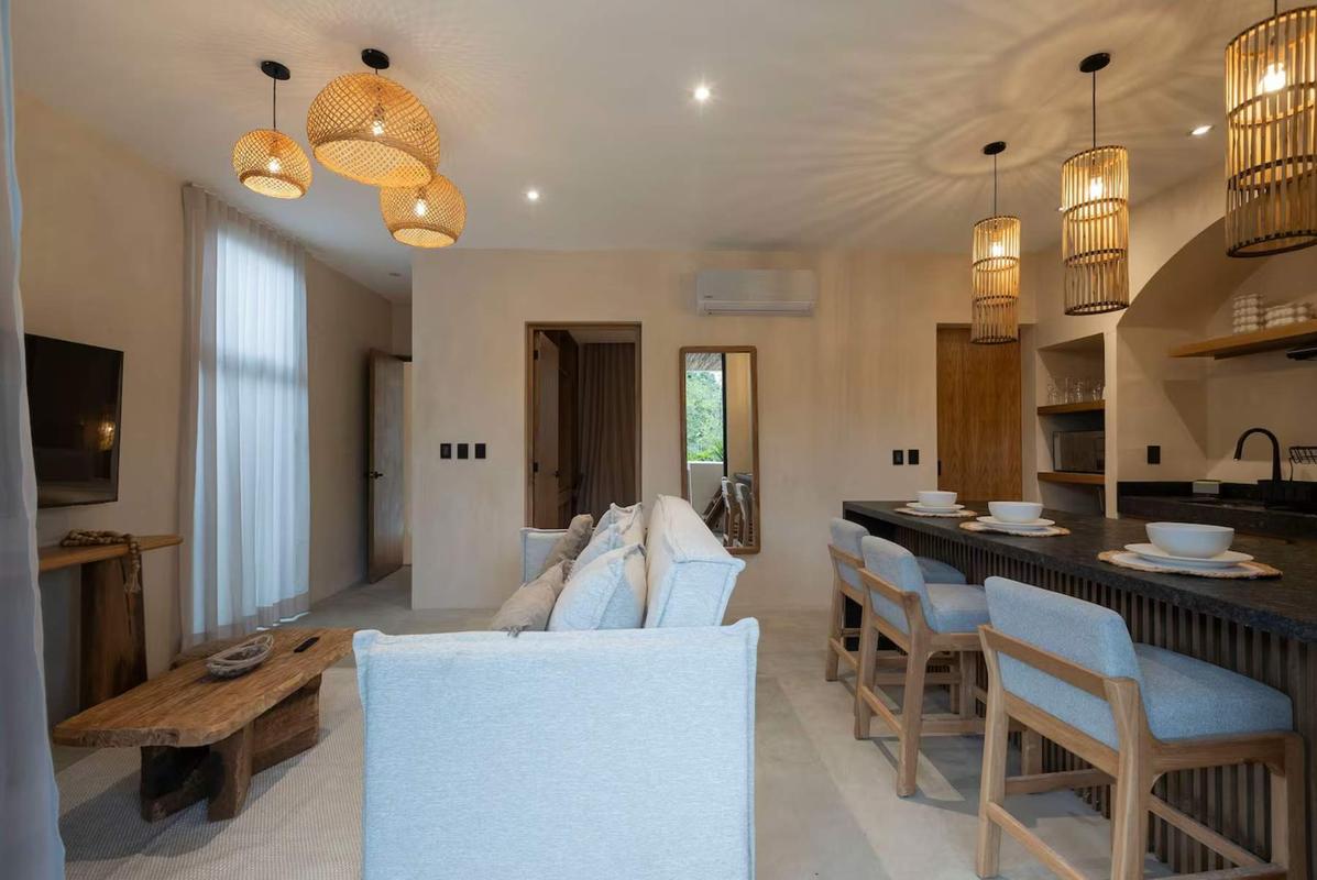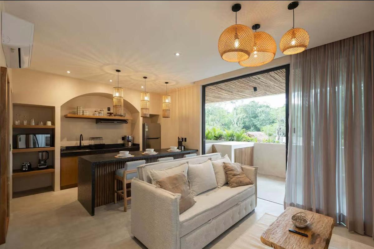 In the heart of the Tulum jungle, this serene retreat invites you to disconnect from the world. The design in white and beige tones creates a calm and cozy atmosphere, perfect for unwinding. Enjoy your private pool surrounded by lush greenery and let yourself be embraced by the unique tranquility this haven offers. The accommodation features a king-size bed, a sofa bed, a fully equipped kitchen, high-end appliances, a workspace, washer/dryer, and every detail designed for a comfortable and sophisticated stay. It’s the perfect place for couples or small groups of up to 4 guests. Located in Region 15, you’ll be just 6 minutes from the main avenue and 3.5 km from the hotel zone. This space offers the perfect blend of jungle peace and proximity to Tulum’s vibrant life—beaches, restaurants, beach clubs, and the lively Calle 7 in La Veleta, known for its mix of bars and boutiques. During your stay, you’ll have access to parking, night security, common areas with two stunning pools, and complimentary cleaning. Pets are also welcome under basic coexistence rules. Please note that occasional power outages or mild construction noise may occur, but the serenity and comfort of this retreat will make your getaway unforgettable. IMPORTANT INFORMATION Cancellation policy: If you cancel less than 7 days before your arrival, no refund will be issued.