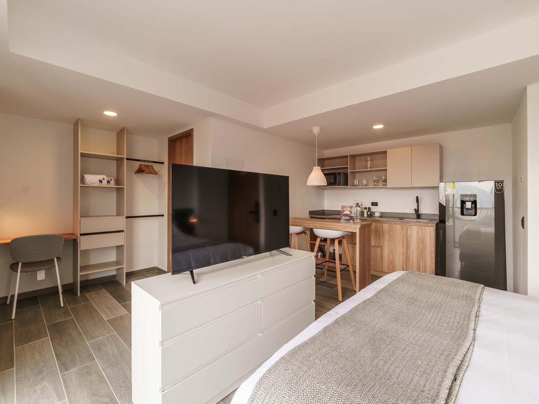 Enjoy a comfortable and modern stay in this one-bedroom loft located in one of Medellín's most desirable and convenient areas. Ideal for couples, business travelers, or tourists seeking comfort, style, and an excellent location. It features a queen bed, a full bathroom, a spacious living and dining area, and all the amenities you need for a pleasant stay. Just minutes from restaurants, cafes, parks, and the city's main attractions.