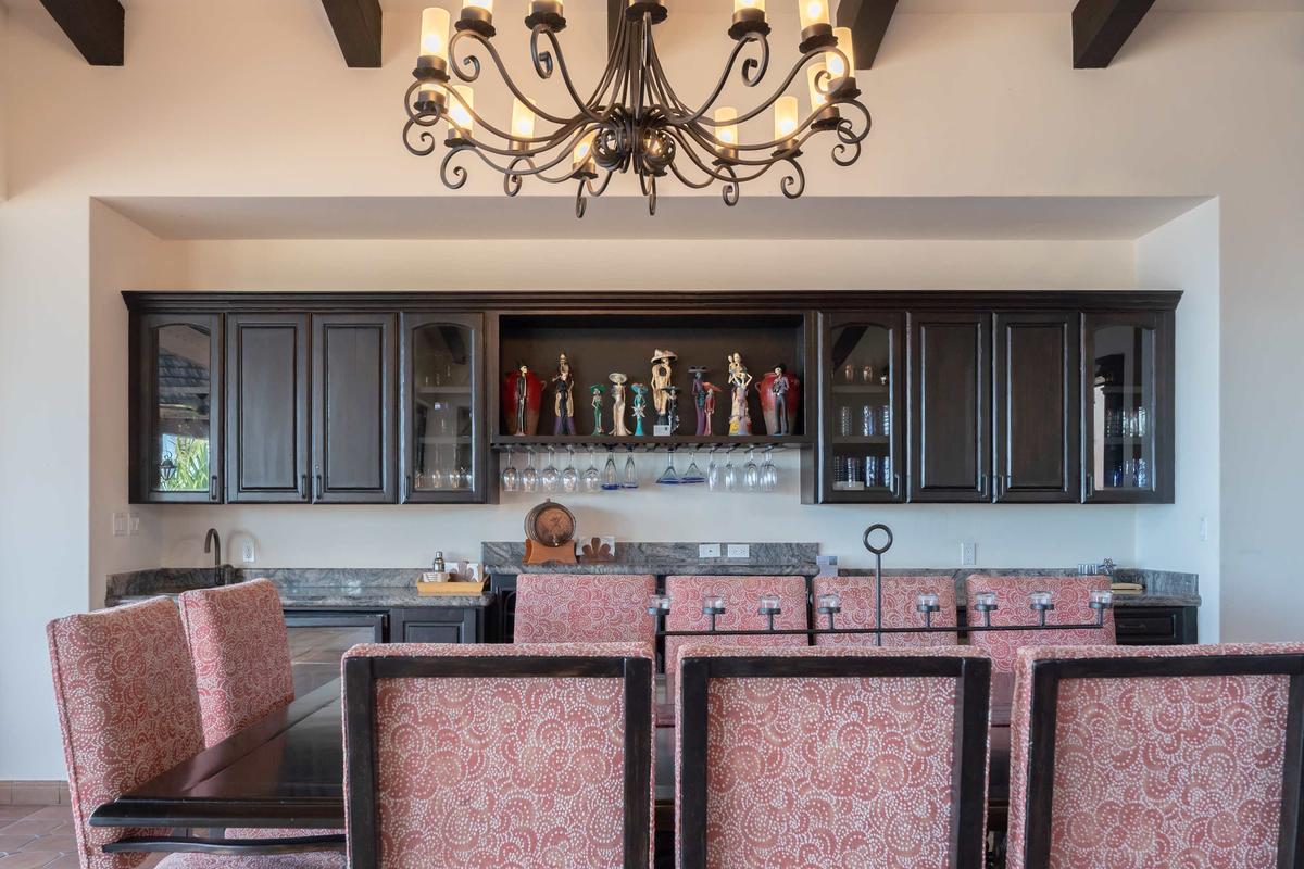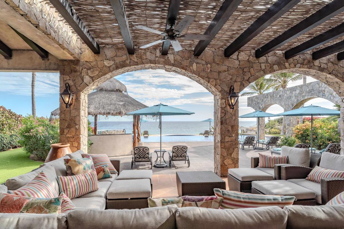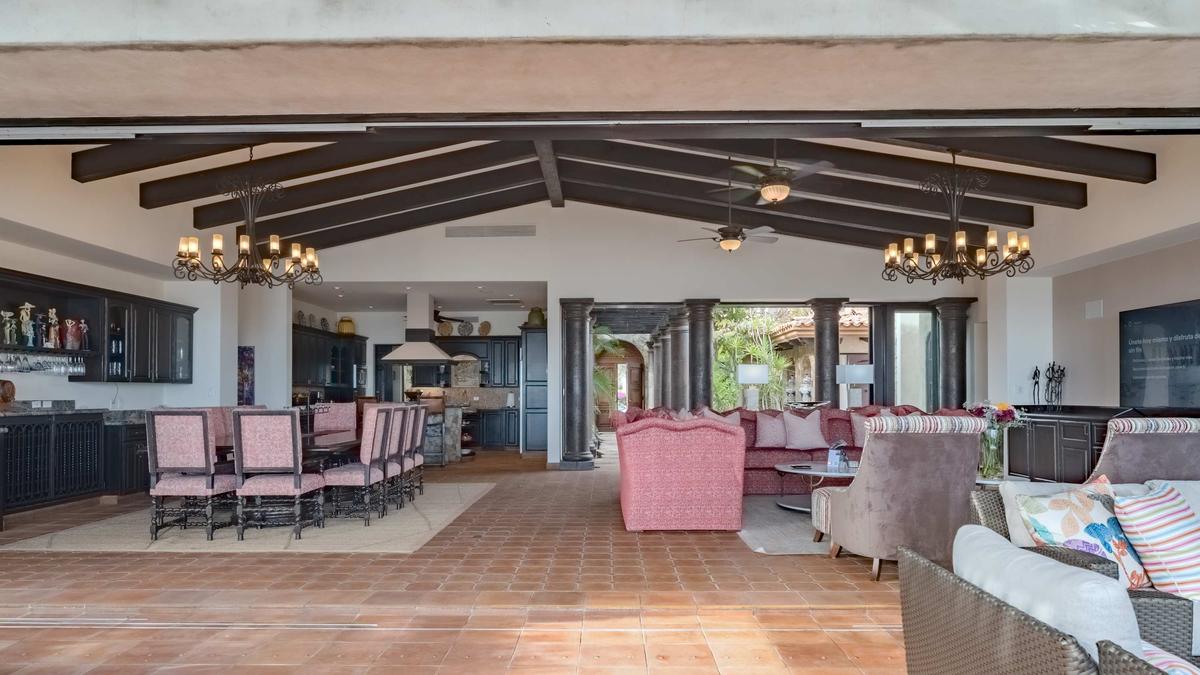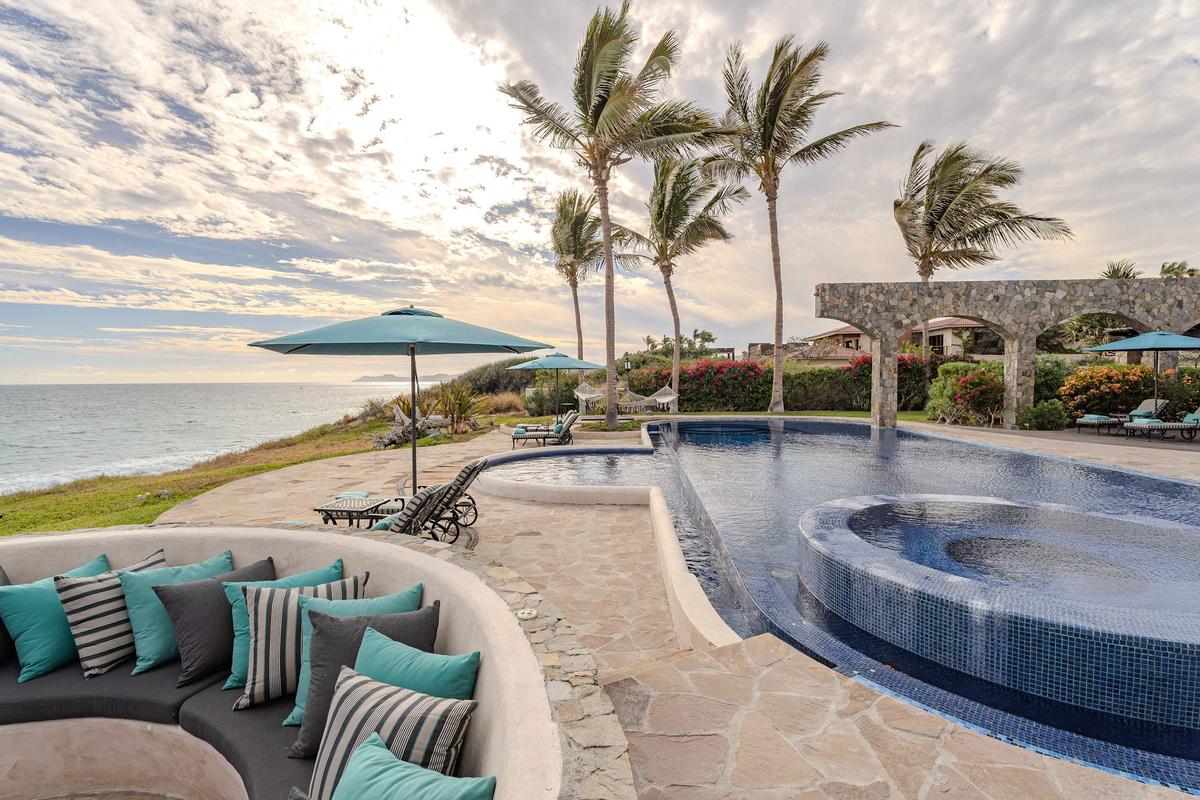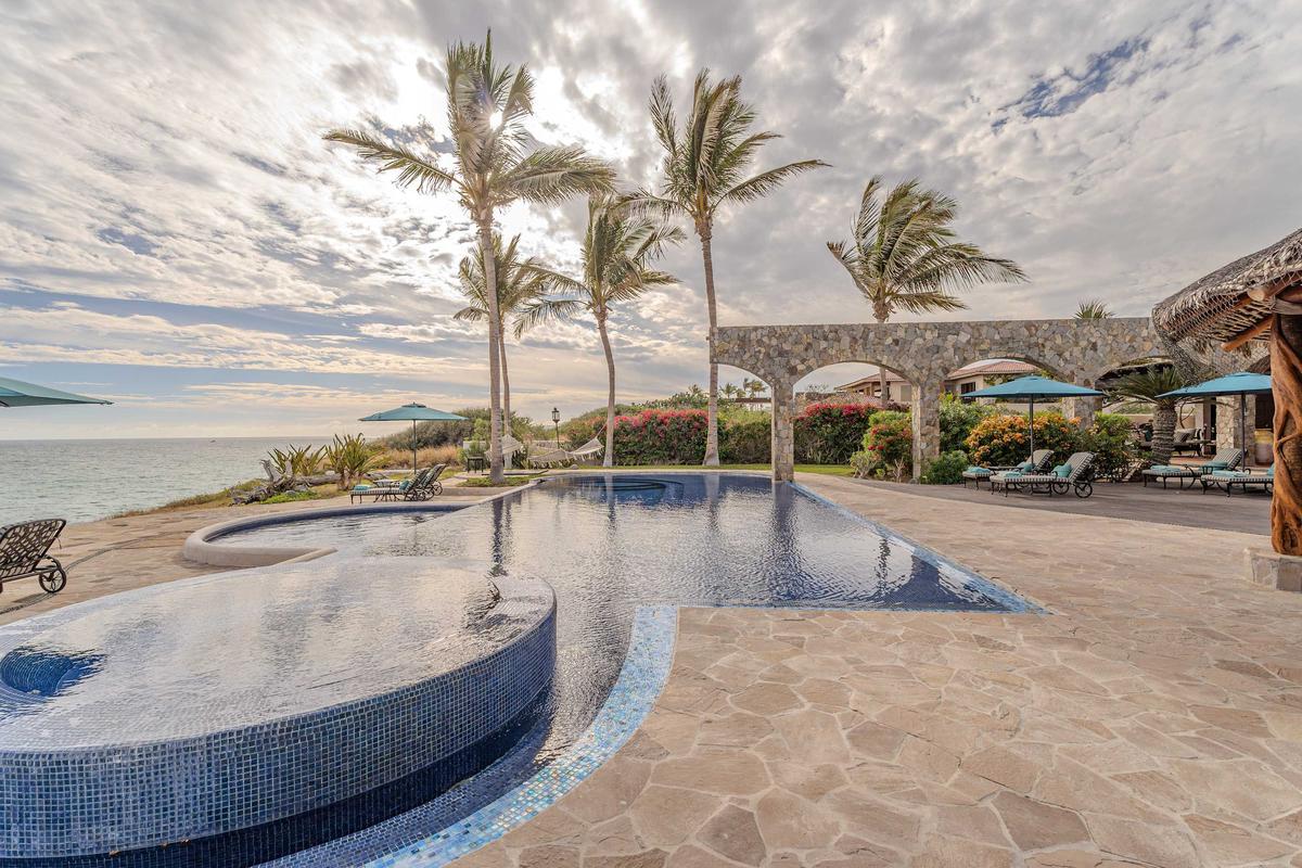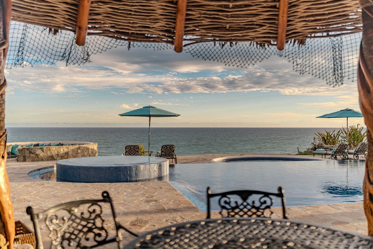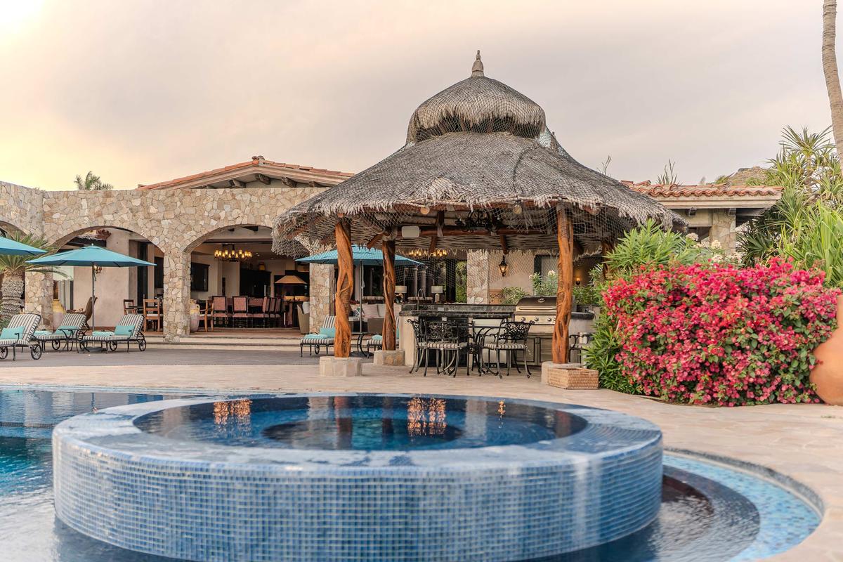 Amenities include a large palapa with a summer kitchen, heated pool with 10 loungers, jacuzzi, BBQ grill, gas fire pit, bar with panoramic terrace, and a covered dining area by the pool. Book your stay and immerse yourself in the luxury and magic of Los Cabos for an unforgettable escape.
