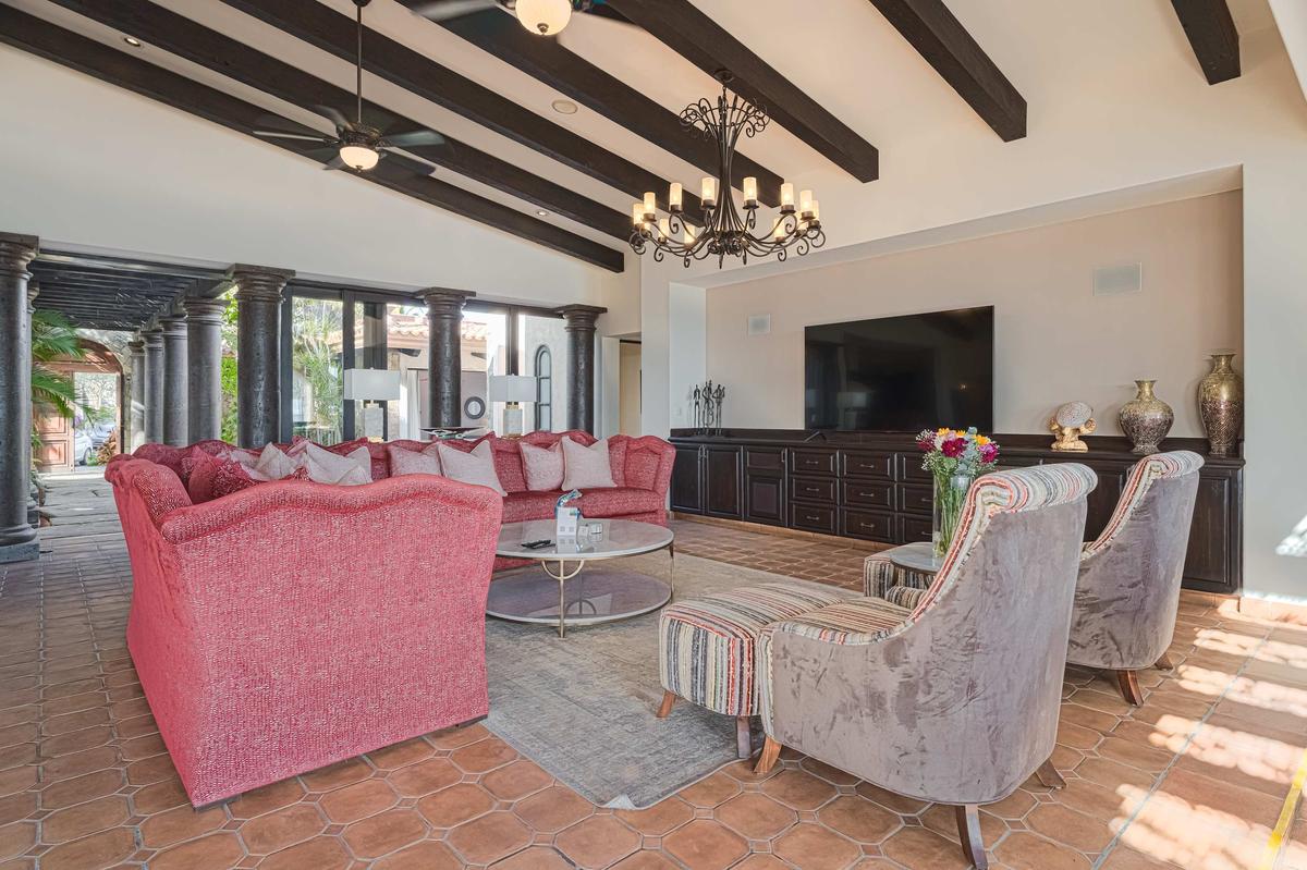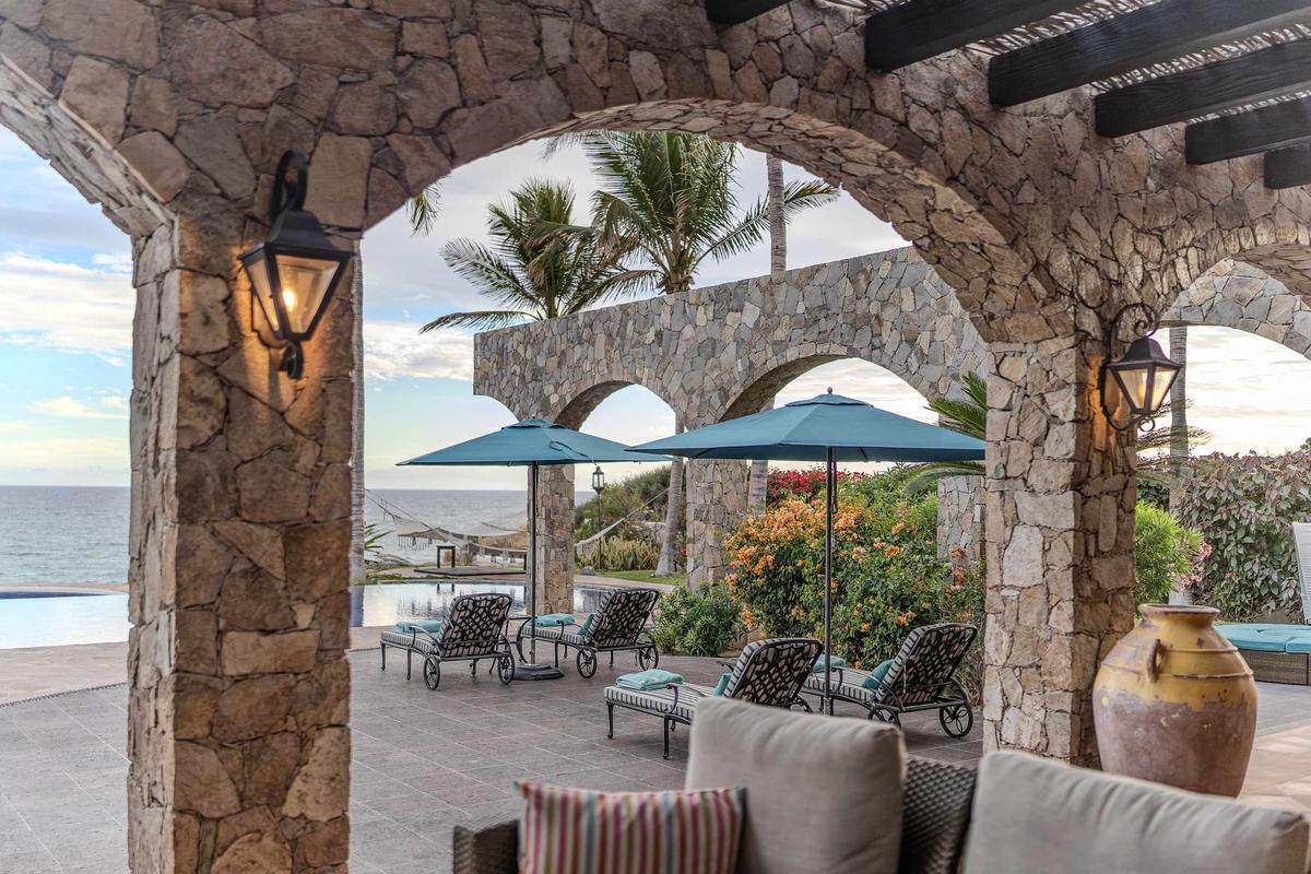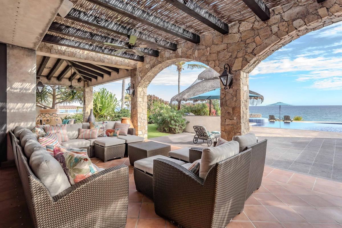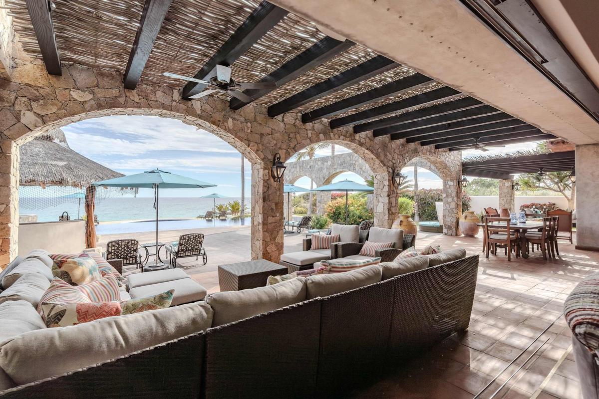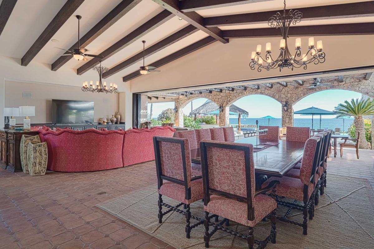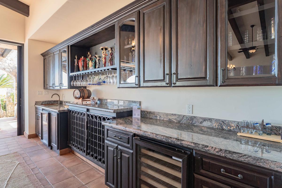 Amenities include a large palapa with a summer kitchen, heated pool with 10 loungers, jacuzzi, BBQ grill, gas fire pit, bar with panoramic terrace, and a covered dining area by the pool. Book your stay and immerse yourself in the luxury and magic of Los Cabos for an unforgettable escape.