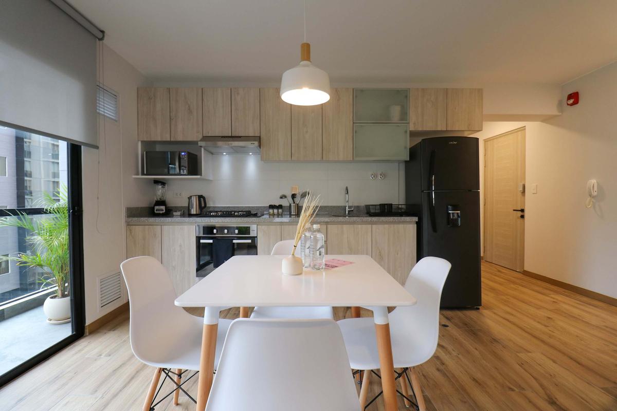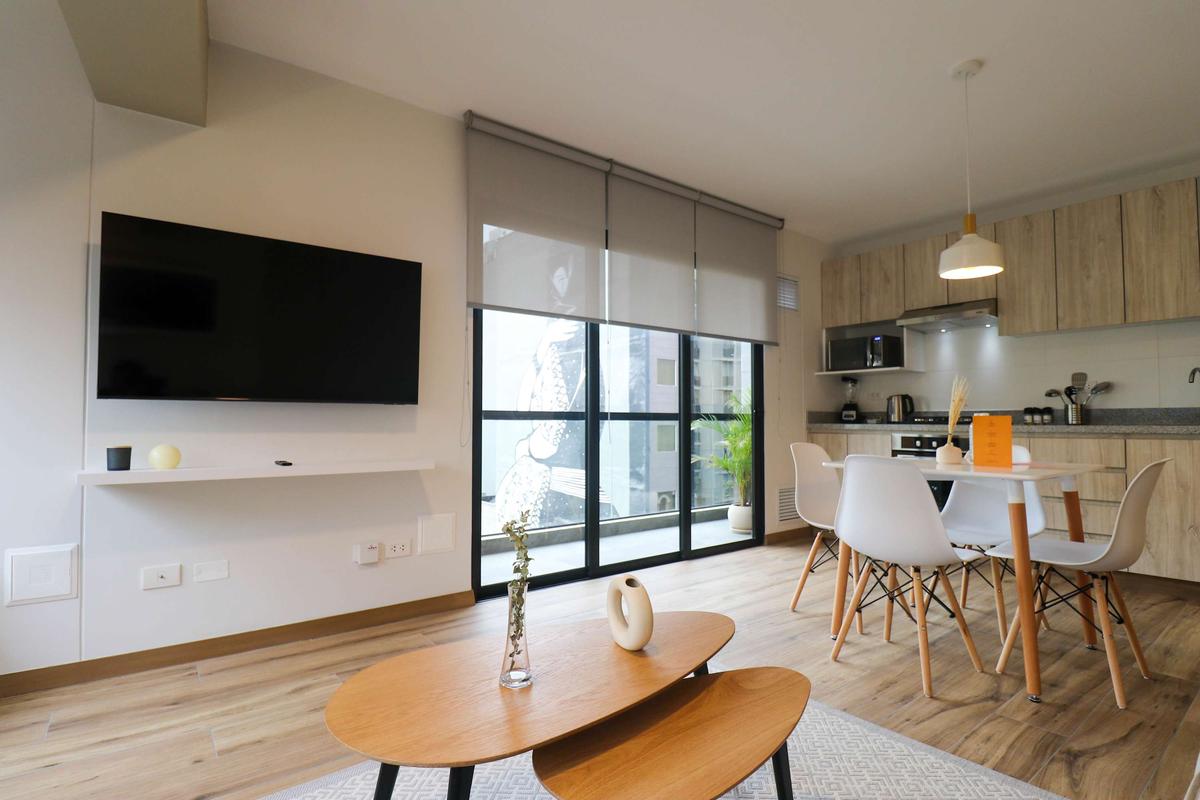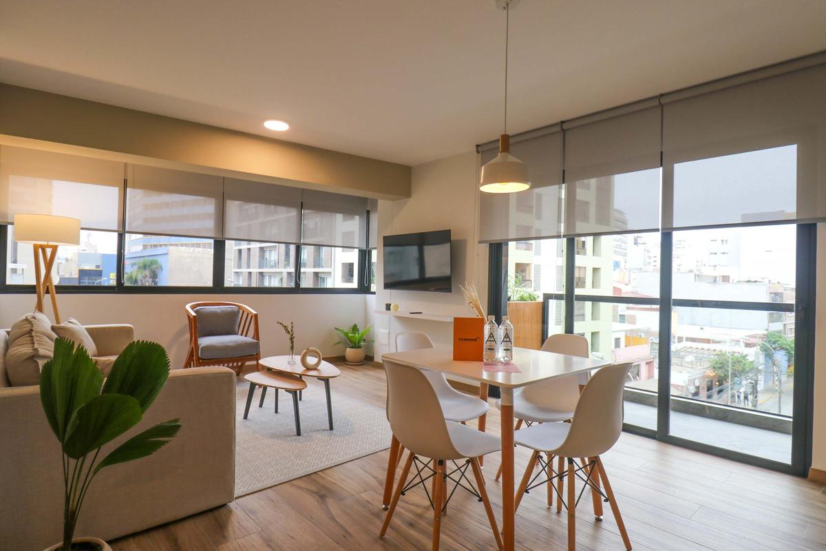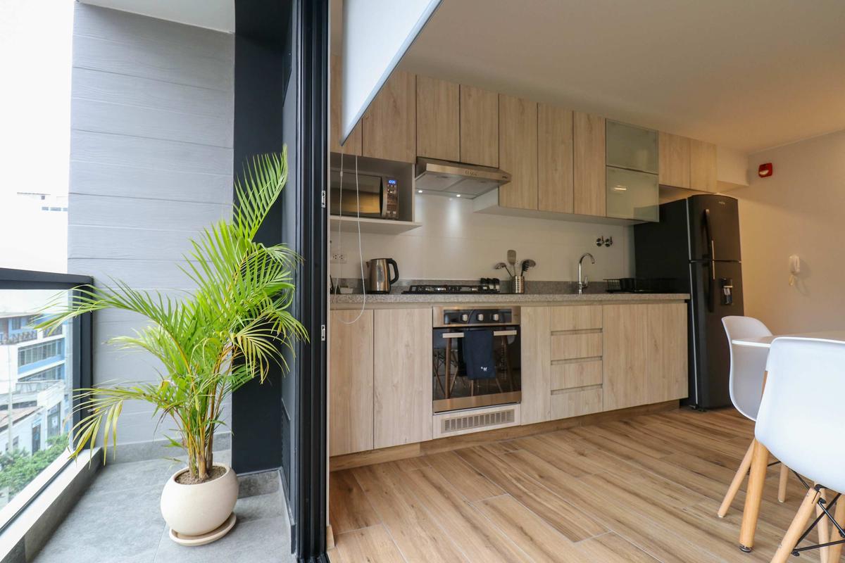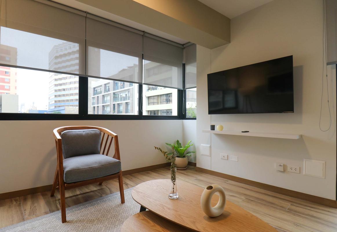 In the welcoming Miraflores neighborhood, this beautiful apartment it's very well located; just minutes away from Larcomar shopping center, Parque Kennedy, Virgen de Fatima Parish, and exclusive gyms. The area has currency exchange services, and labs centers in case you need to take a test, such as ROE and Multilab.
