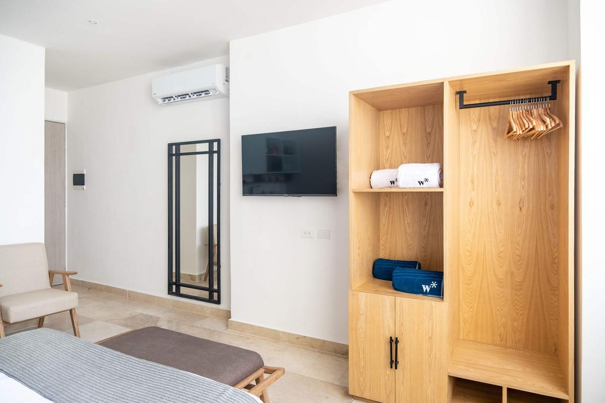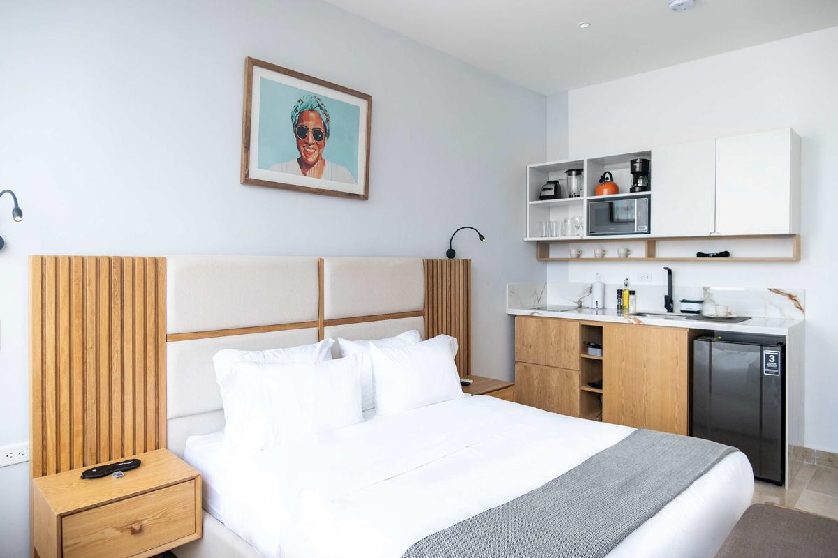 Brand-new 25 sqm exterior-facing design studio located in a luxury hotel-style tower on one of the best blocks in Bocagrande. Thoughtfully designed with premium finishes, modern kitchenette, air conditioning, and fast Wi-Fi. The studio offers exterior views and a bright, comfortable layout. The well-known Spinning Center Gym Cartagena is located within the same tower—ideal for short or extended stays.