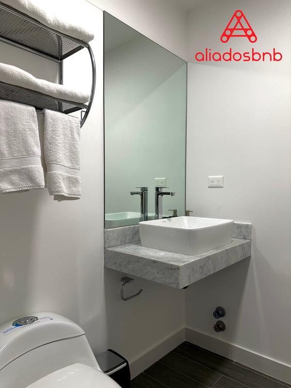 Experience the best of the city in our modern 1-bedroom apartment. Relax in a luxurious queen bed and enjoy entertainment with Smart TVs in the living room and bedroom. Prepare your meals in the fully equipped kitchen. Our location, strategically situated near the financial district, puts you in the heart of the business action.
