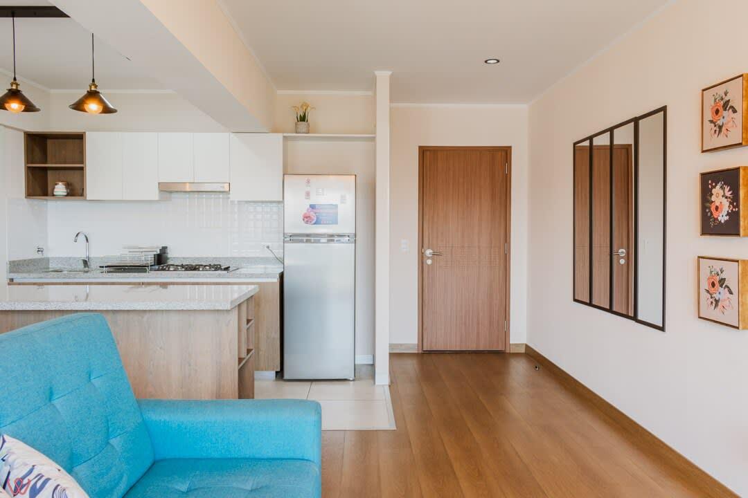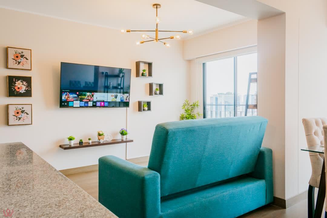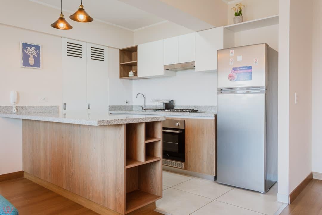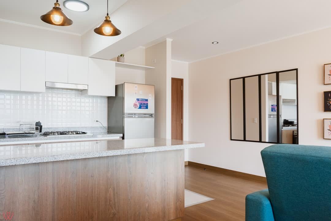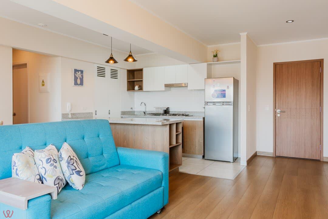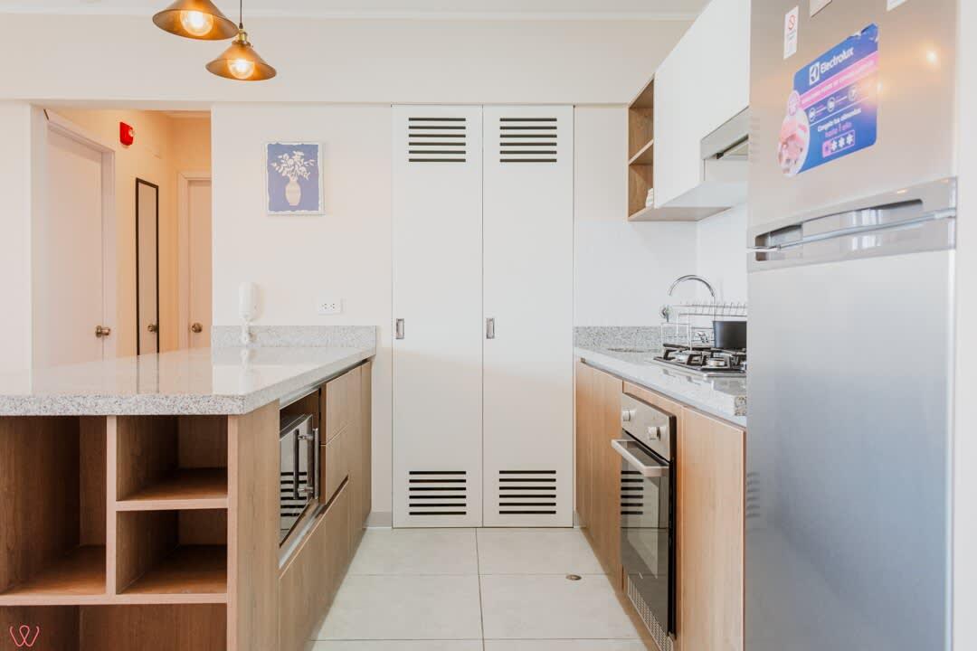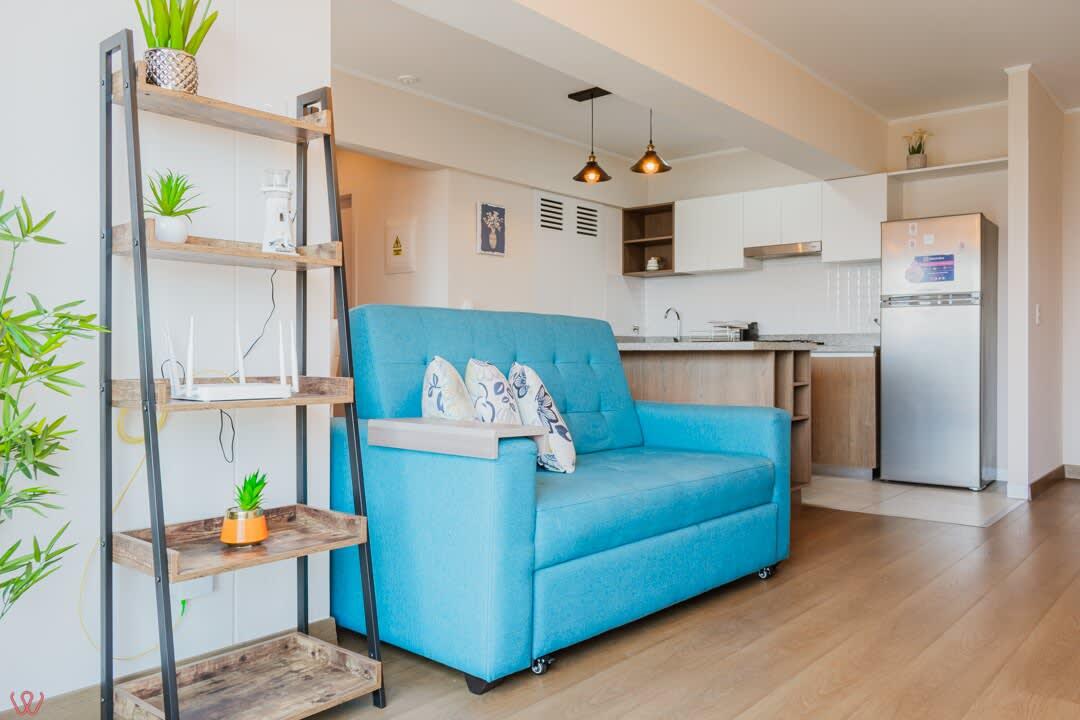Departamento de estreno en Surquillo, cerca al centro financiero, acondicionado para 4 huéspedes (con un sofá cama para albergar a 2 más).