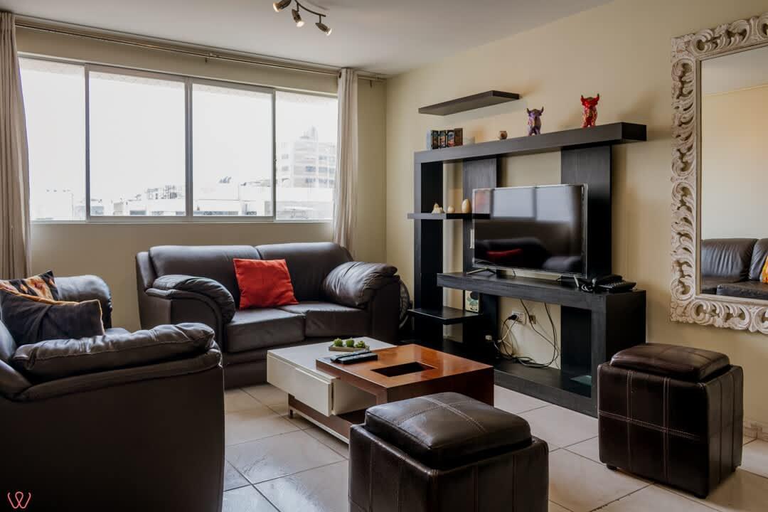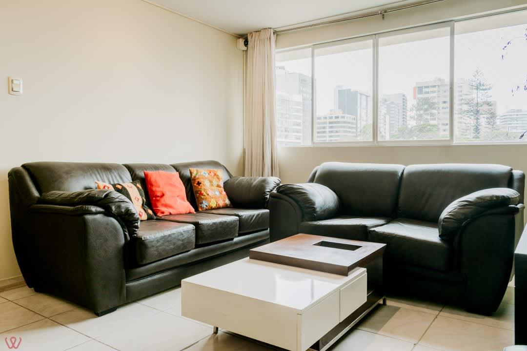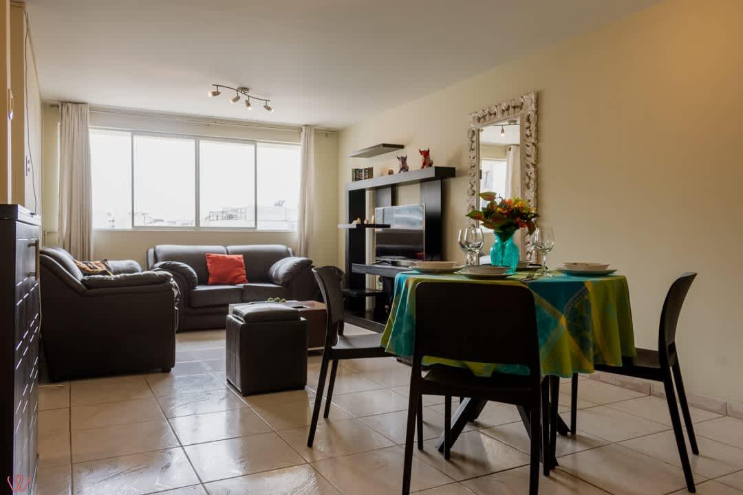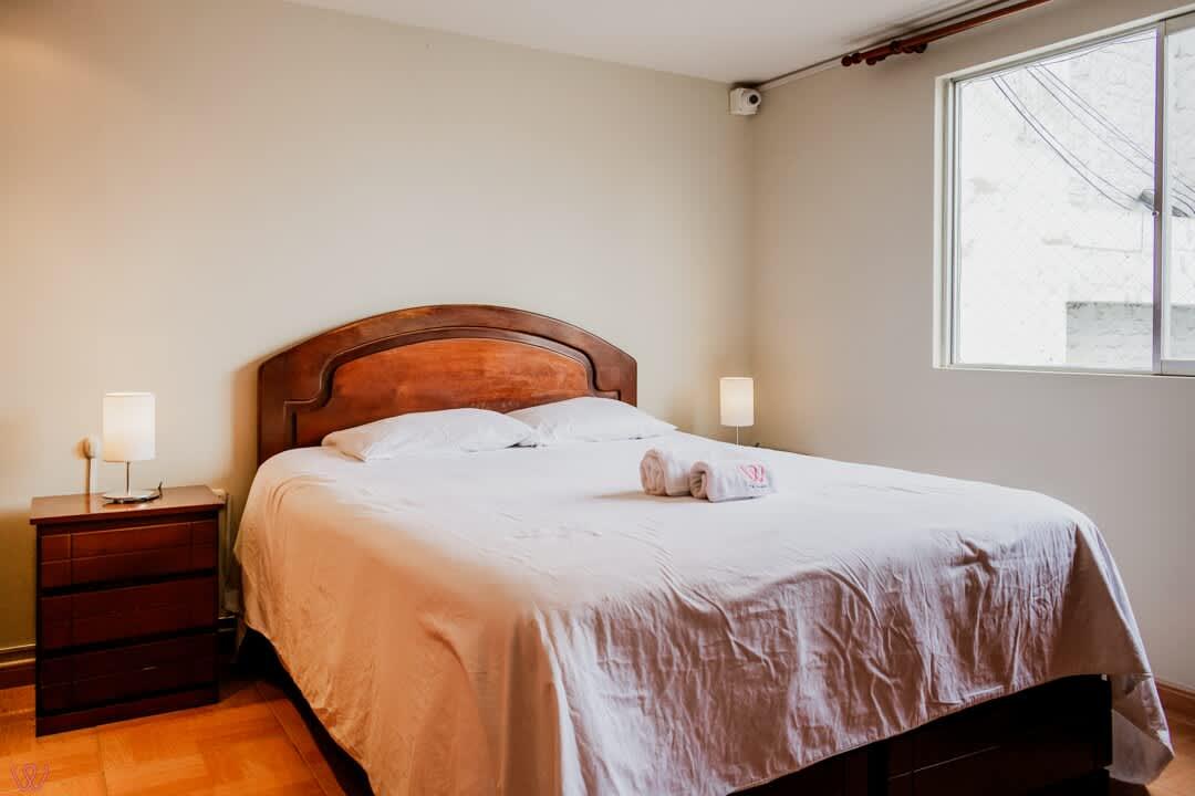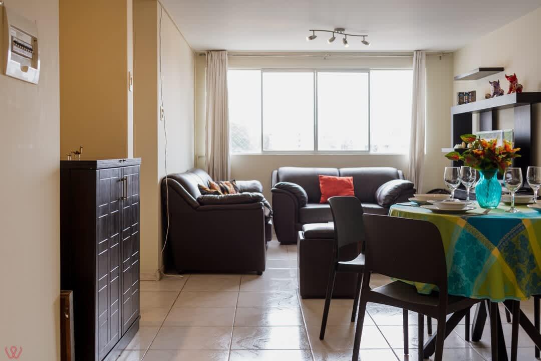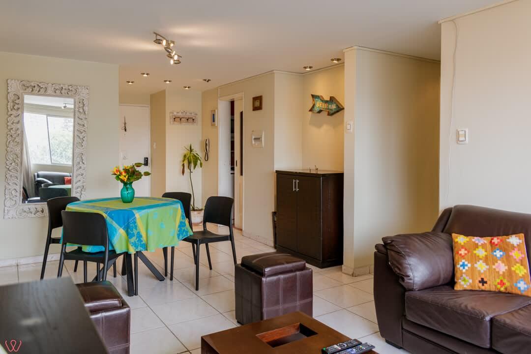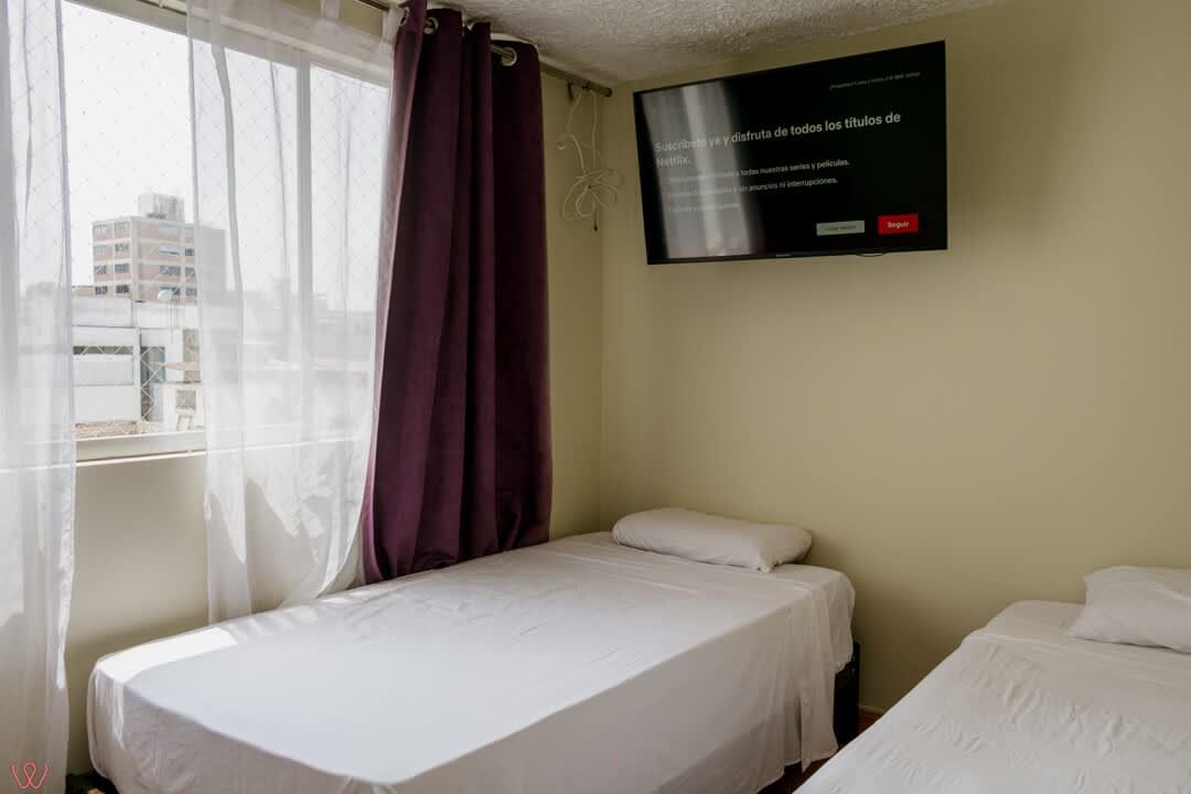 Departamento ubicado en Miraflores, acondicionado para 4 huéspedes con 1 cama matrimonial y 2 camas individuales.