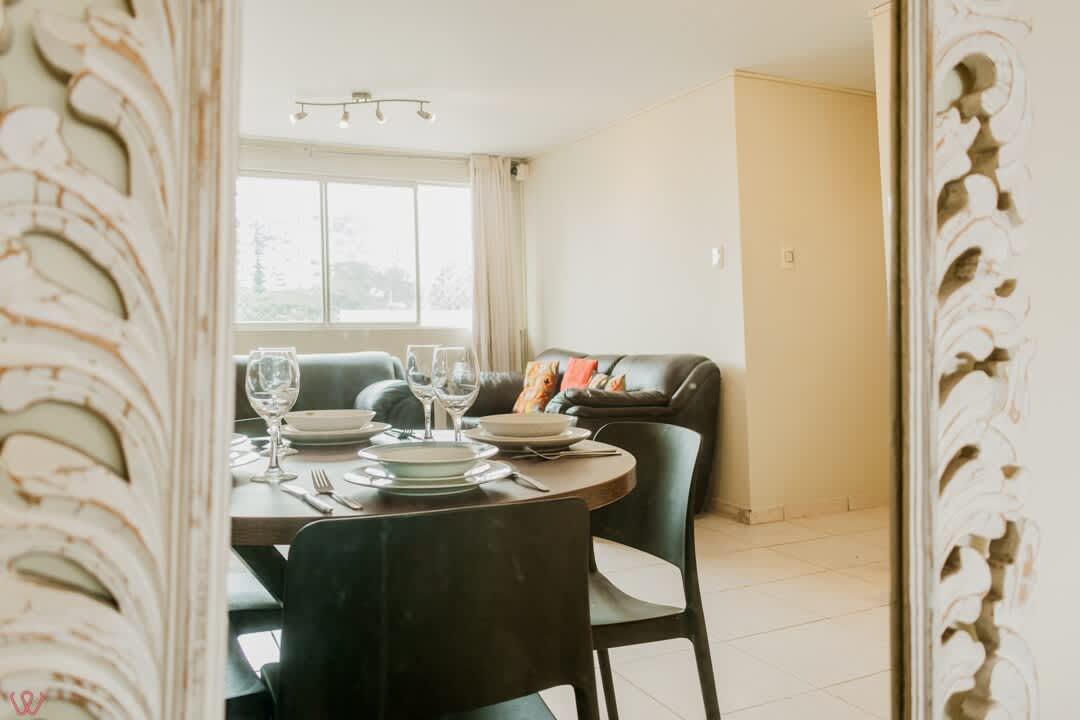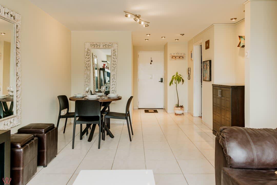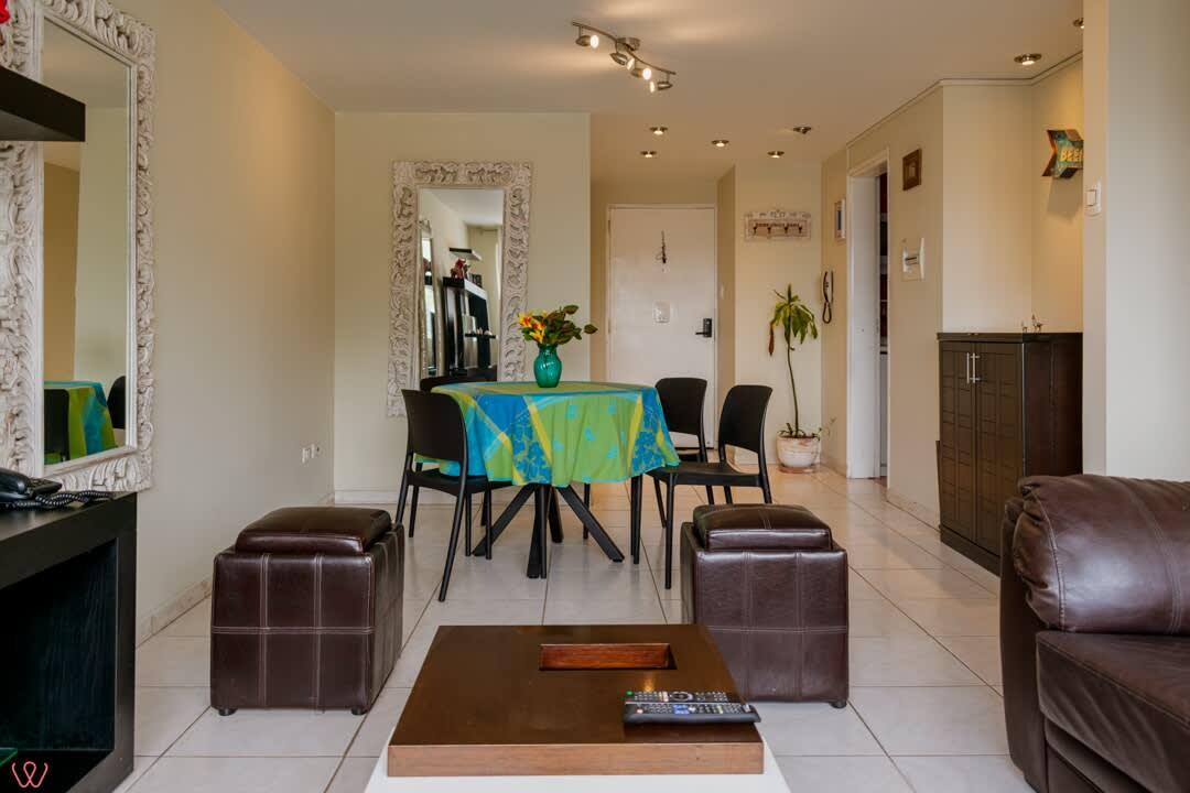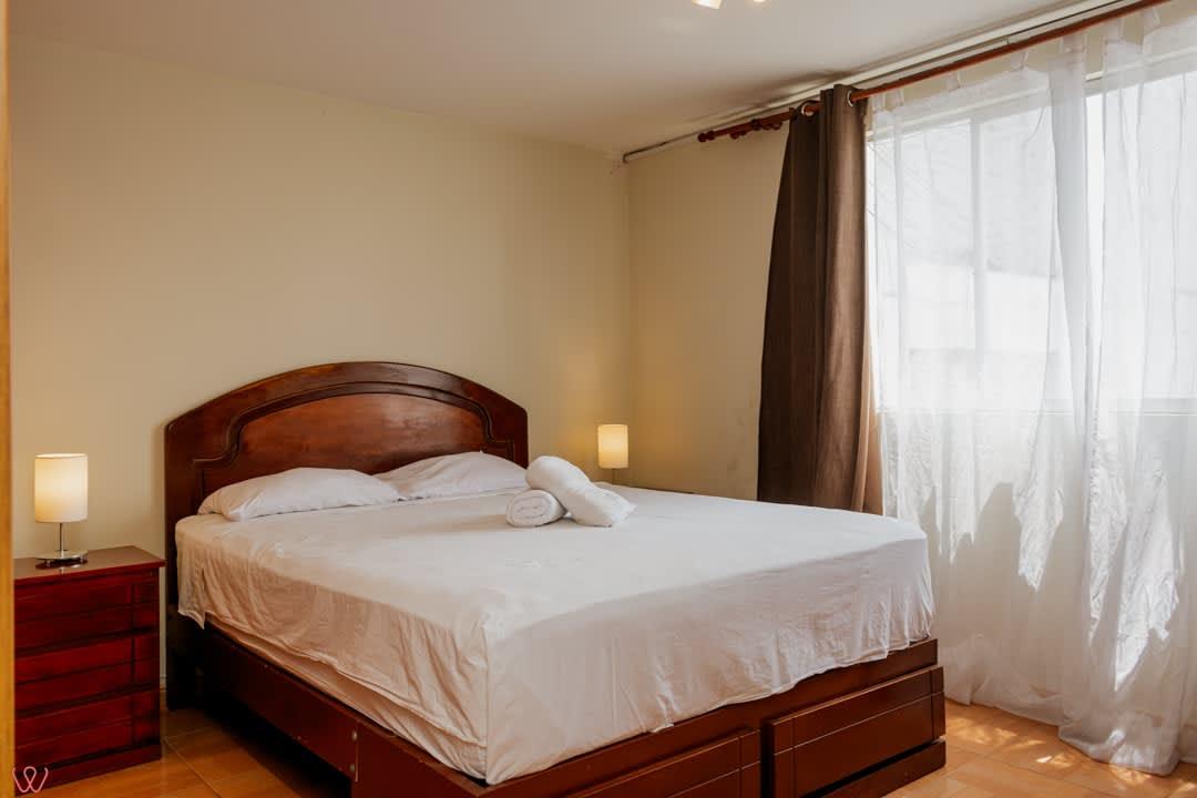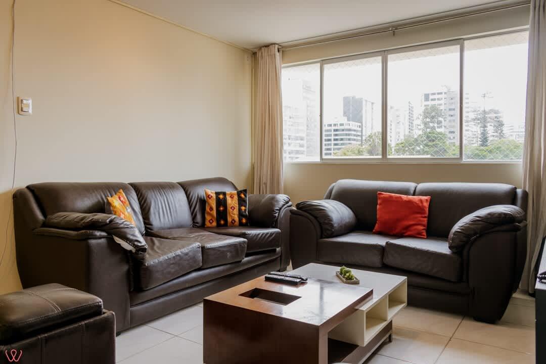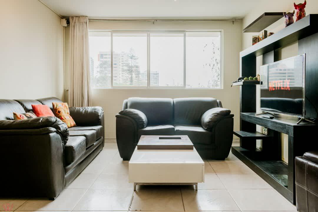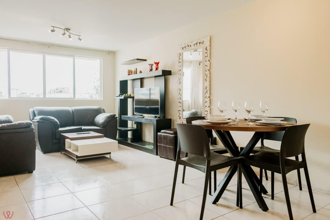 Departamento ubicado en Miraflores, acondicionado para 4 huéspedes con 1 cama matrimonial y 2 camas individuales.