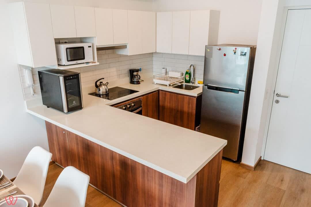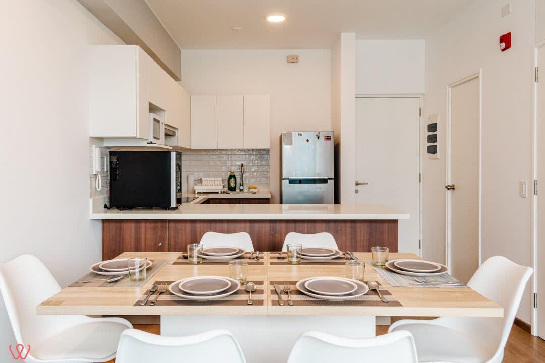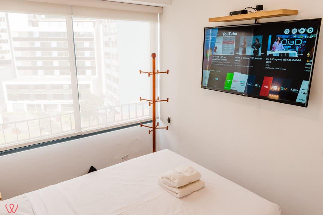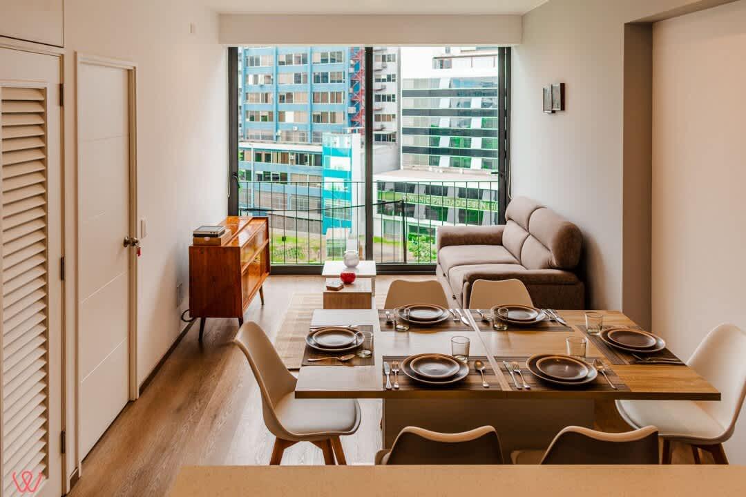 Modern apartment located at Calle Las Camelias 845, San Isidro. Features a Queen-size bed, sofa bed, and one full bathroom. Includes a fully equipped kitchen, cozy living area, and high-speed Wi-Fi. Situated in a prime area near business centers, restaurants, parks, and the Lima Golf Club. Ideal for a comfortable city stay.