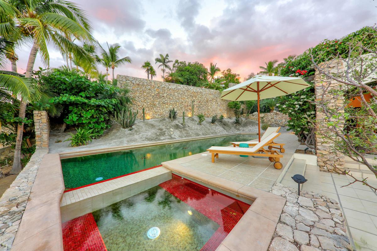 Outdoors, the villa offers multiple spaces to relax and enjoy the ocean: heated pool, jacuzzi, oceanfront terrace, private palapa, outdoor dining area for 6 guests, BBQ grill, firepit, sun loungers, and an oceanfront garden. Each space allows for unforgettable moments by the sea — whether sunbathing or watching the sunset.
