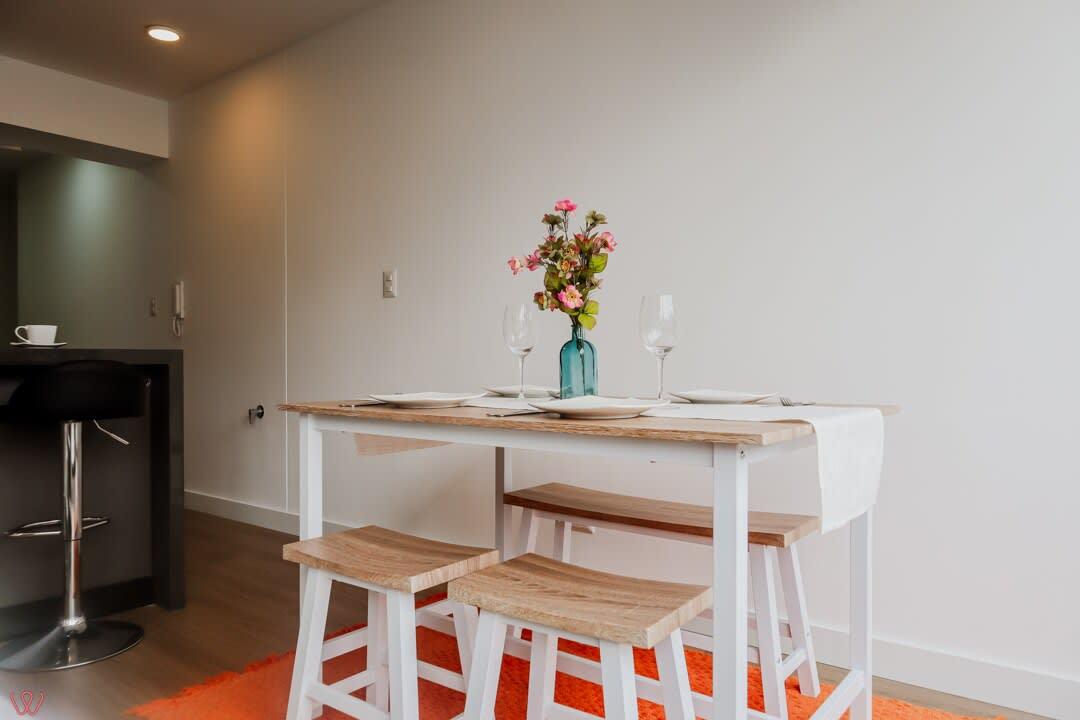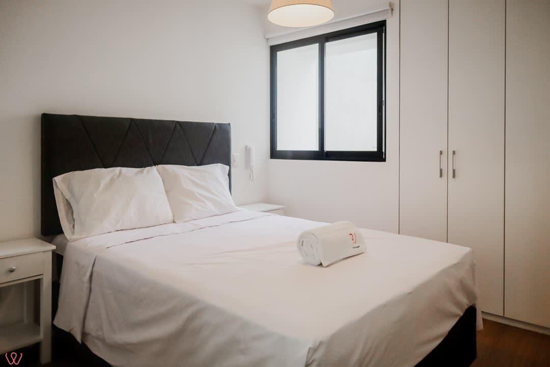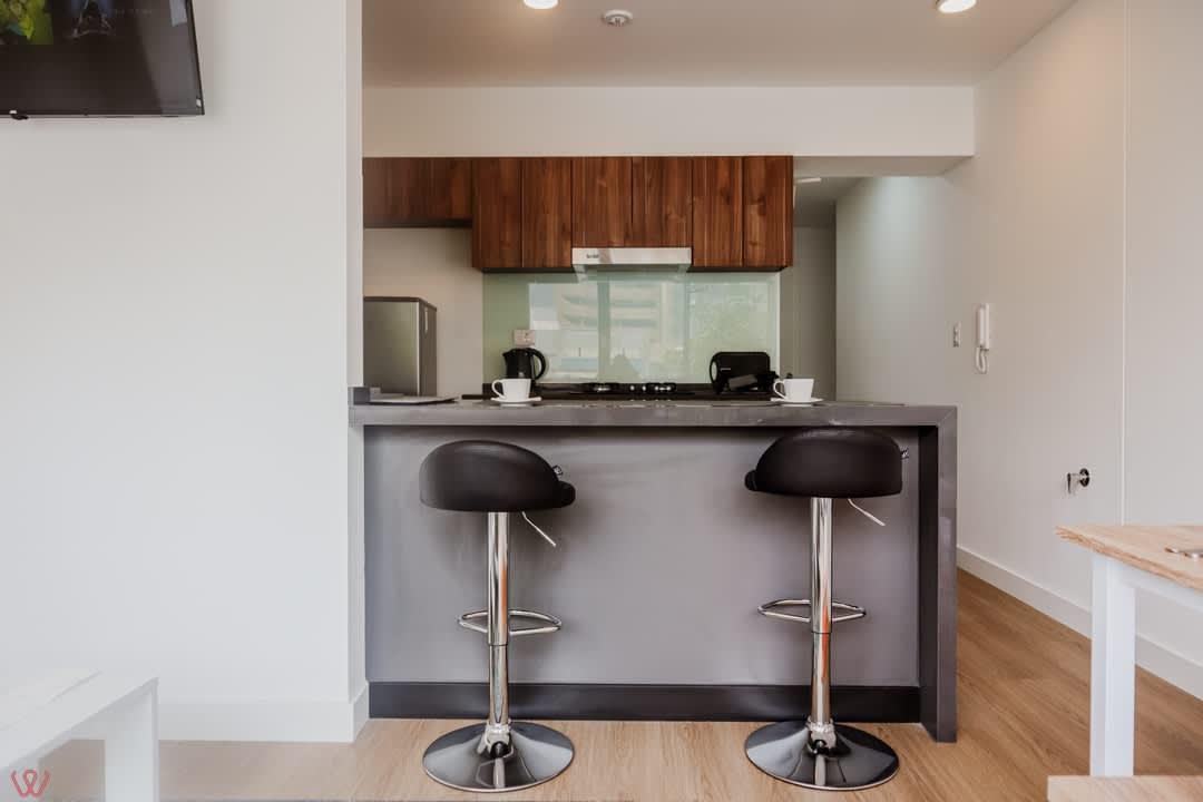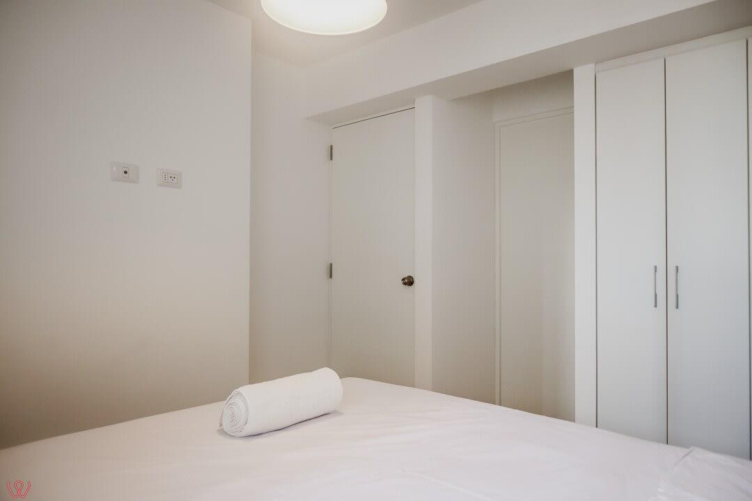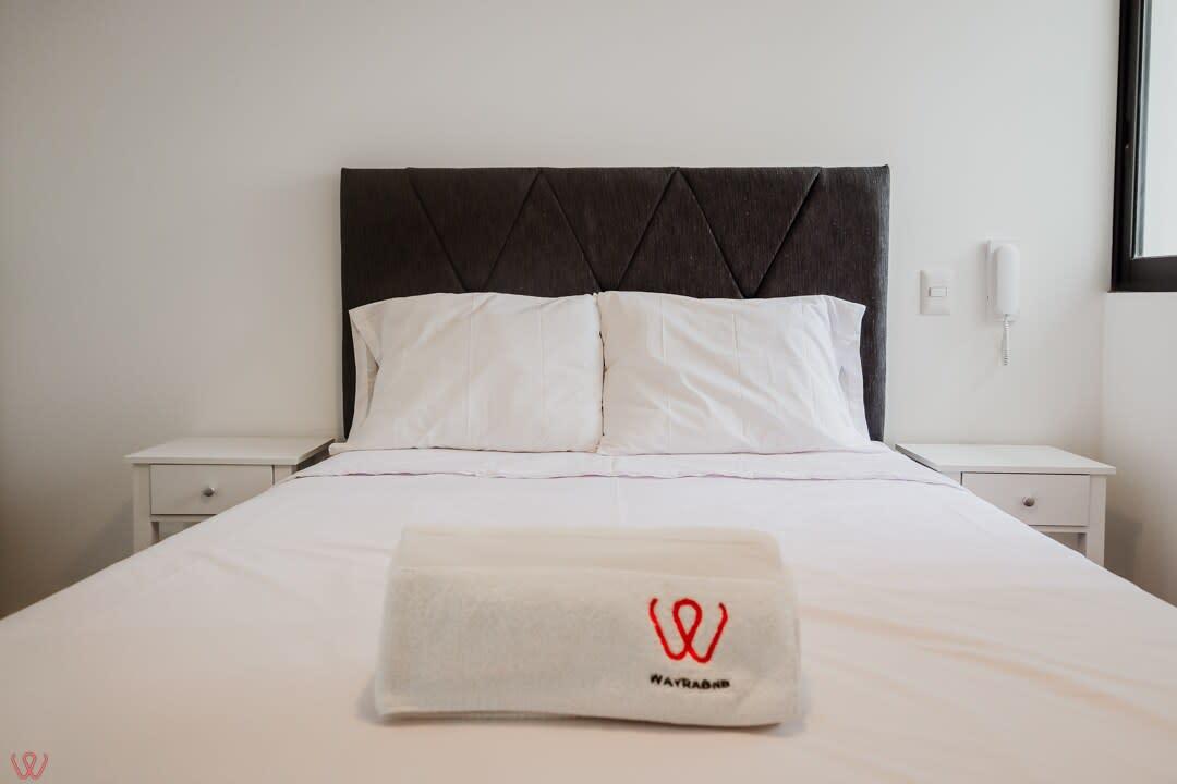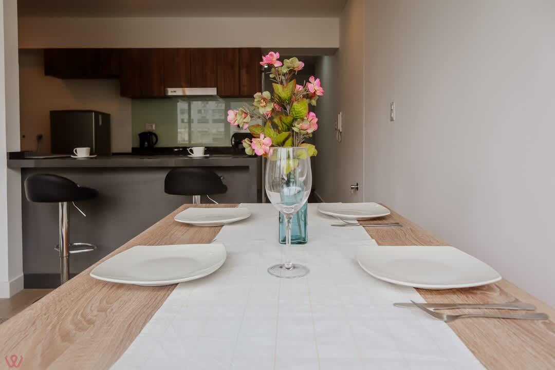 El edificio es seguro, tranquilo y céntrico. El departamento tiene un diseño moderno, cuenta con 2 habitaciones, 2 baños completos, cocina equipada, ropa de cama.