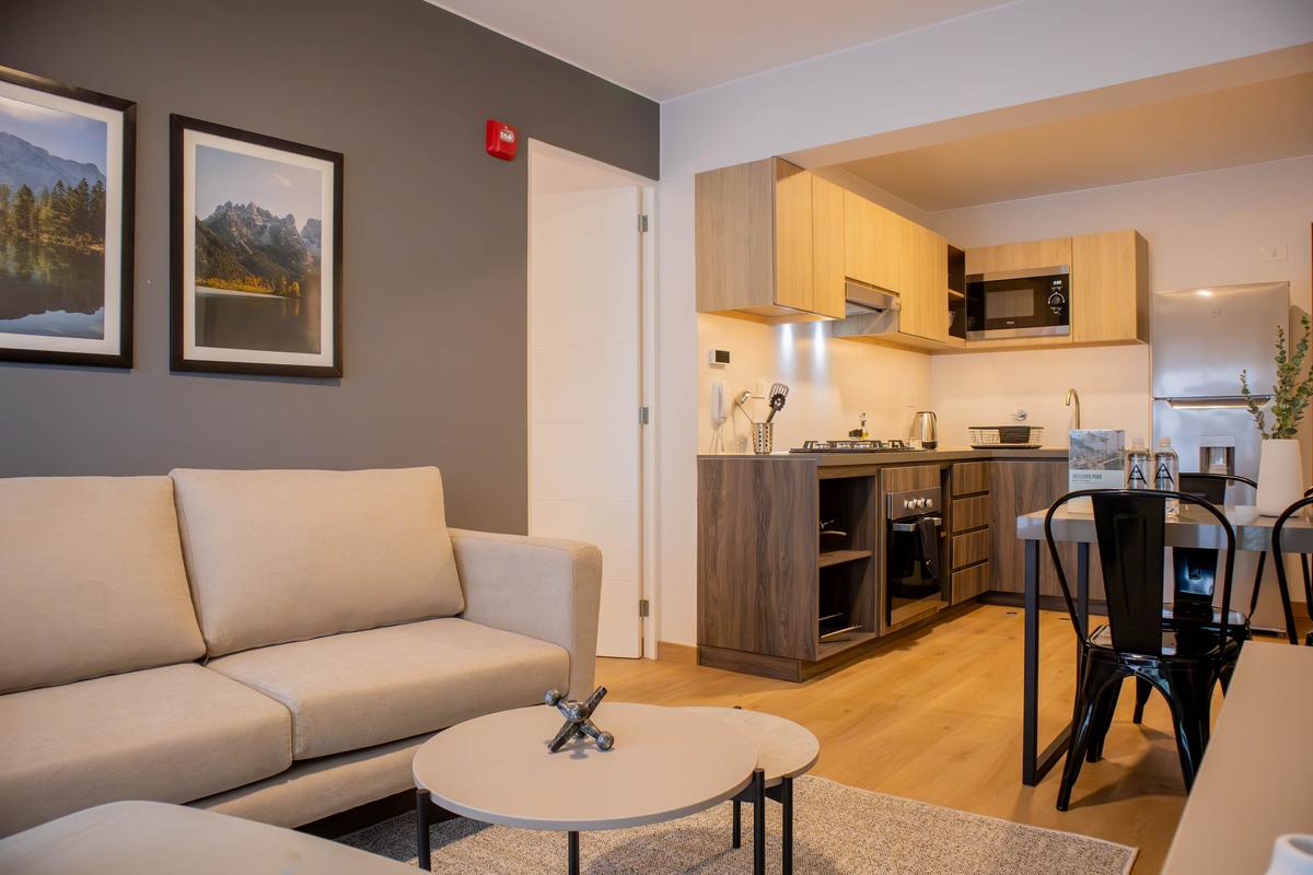 In the welcoming Miraflores neighborhood, this beautiful apartment it's very well located; just minutes away from Larcomar shopping center, Parque Kennedy, Virgen de Fatima Parish, and exclusive gyms. The area has currency exchange services, and labs centers in case you need to take a test, such as ROE and Multilab.
