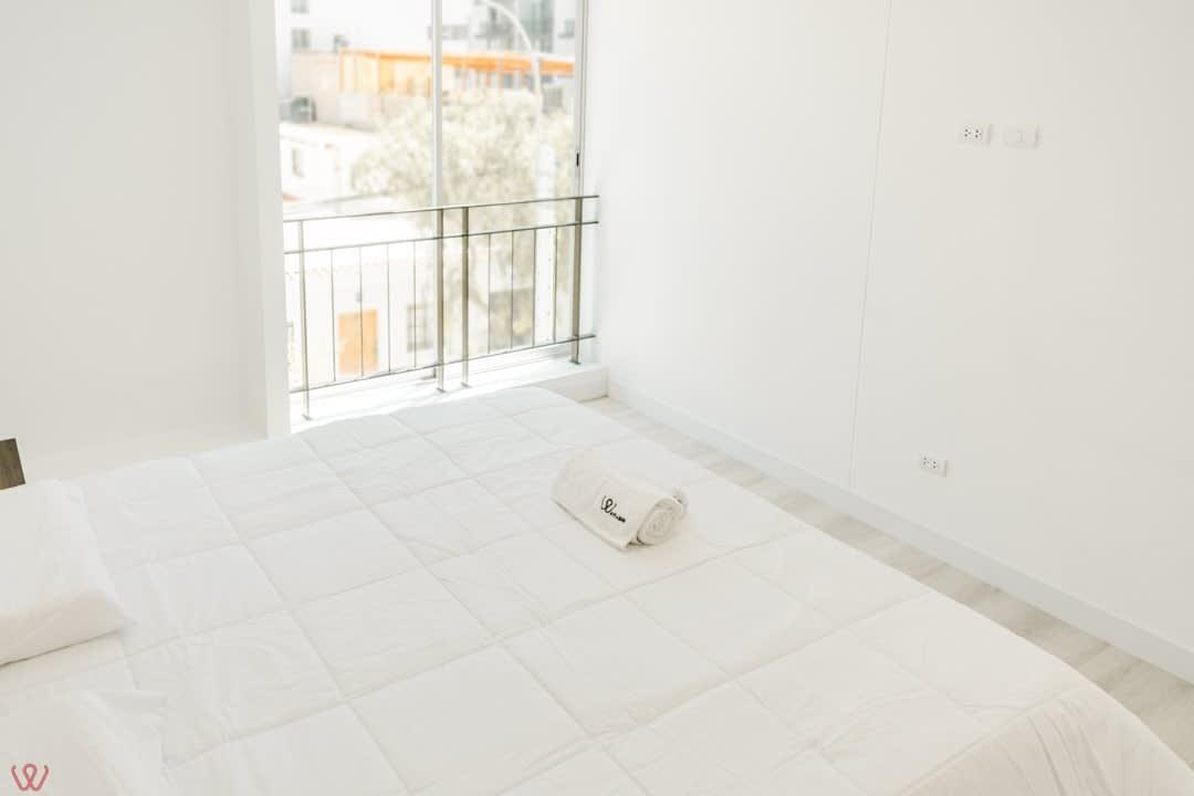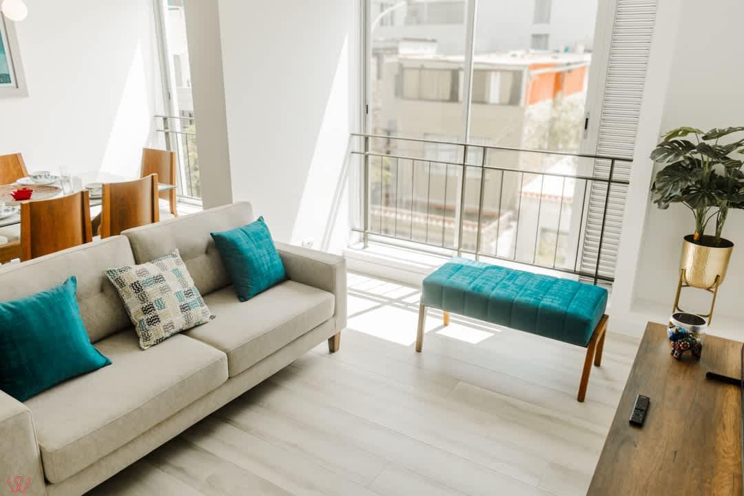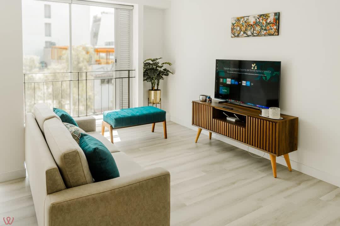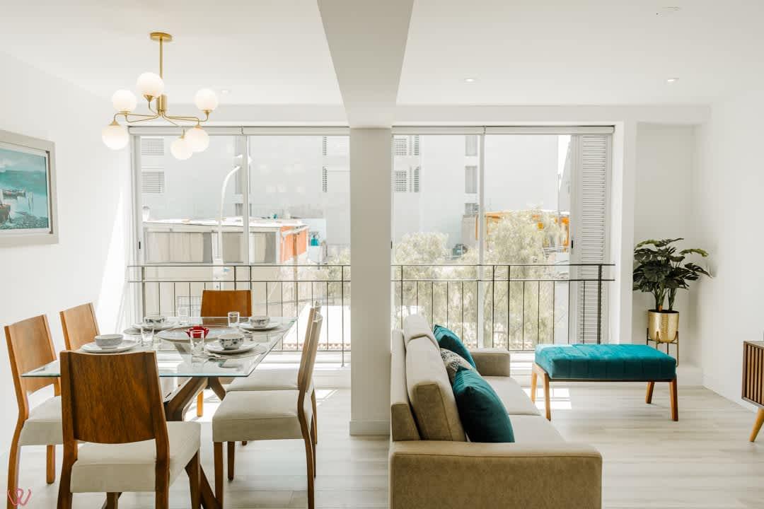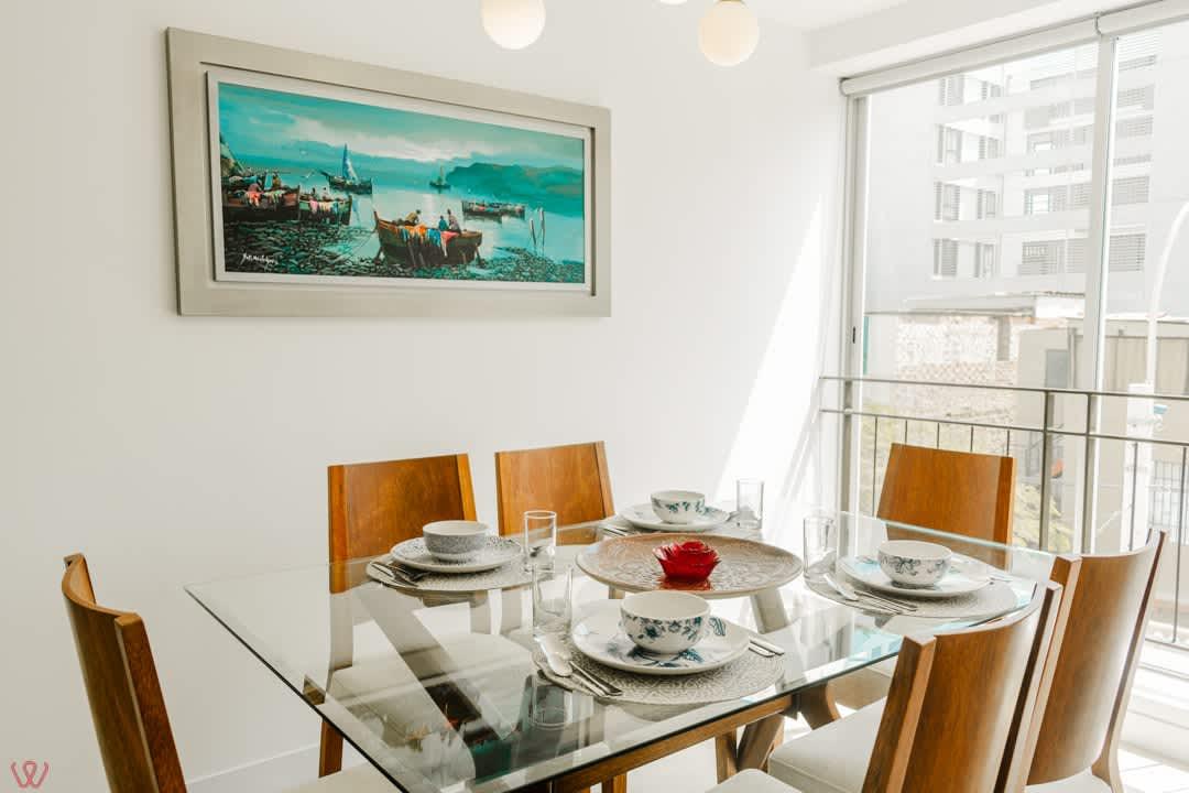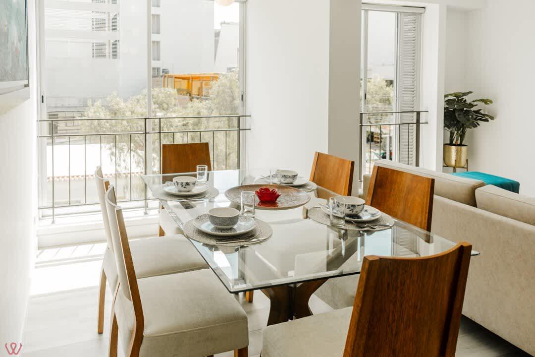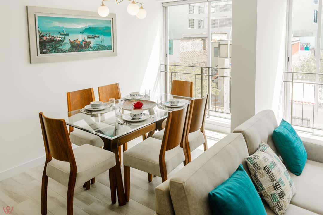 Elegant two-bedroom apartment located in one of the best areas of Miraflores. It features a queen-size bed, a single bed, two full bathrooms, a spacious living and dining room, an equipped kitchen, and Wi-Fi. Located on Avenida General Mendiburu, just minutes from the Malecón, parks, restaurants, and shops. Ideal for business or leisure stays, with easy access to transportation and Lima's main attractions.