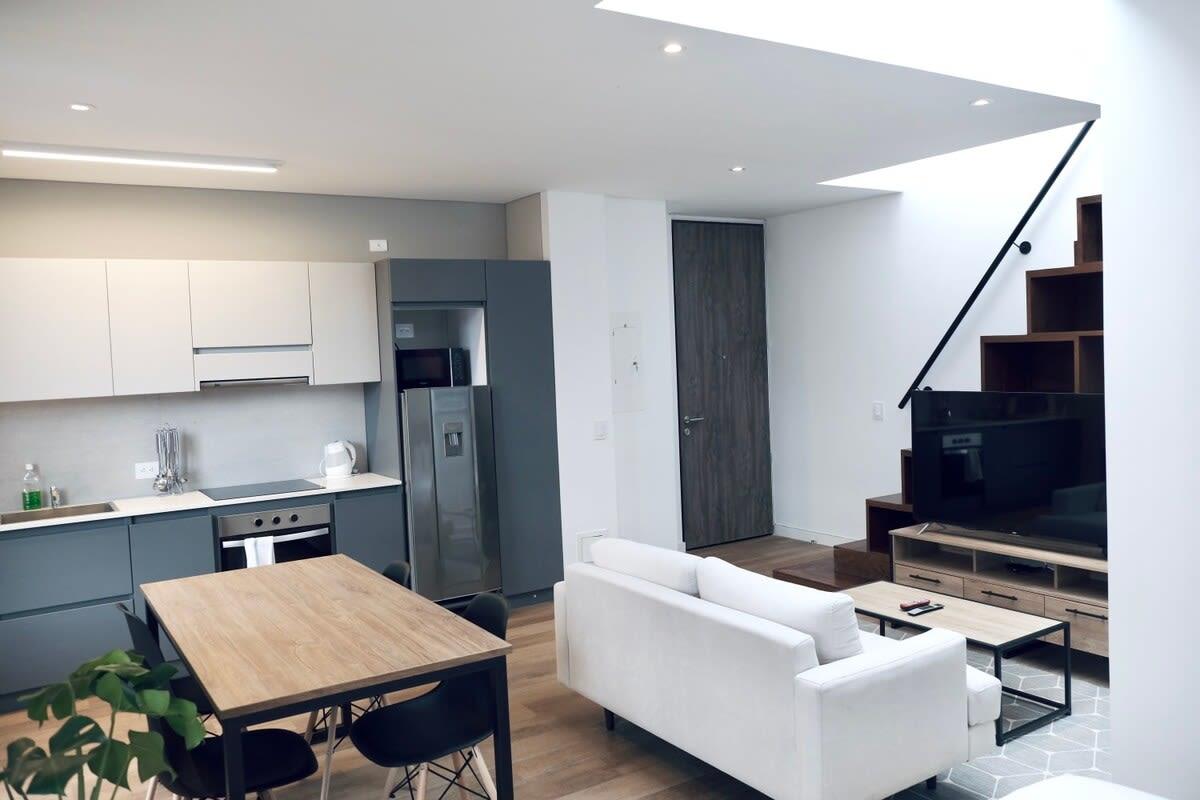 Located in the best area of Bogotá, next to Parque Virrey and Zona Rosa. Ideal for business trips, couples and solo travelers who want to stay in a spacious modern 1 Bedroom Penthouse Duplex. You will be walking distance from the shopping center (Andino), restaurants, top gyms, supermarkets, bars and coffee shops in the city.